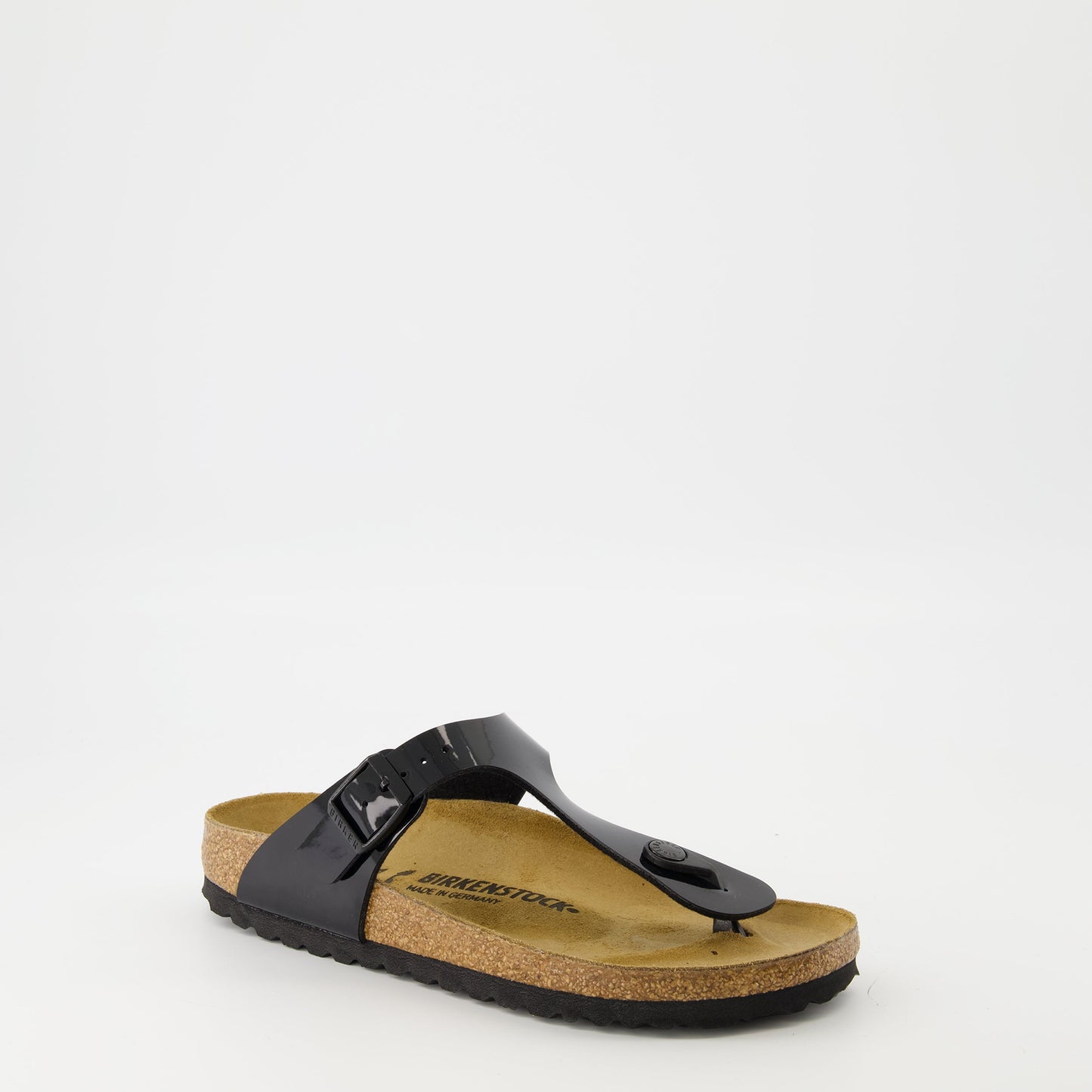 Step into the season with these refined black patent leather flip-flops from Birkenstock. Featuring a sleek, round-toe design and a prominent logo engraving, these sandals combine simplicity with sophistication. The adjustable fit ensures comfort for any foot, while the EVA sole offers lightweight cushioning for everyday wear. A perfect addition to your spring-summer wardrobe, these flip-flops embody a blend of style and practicality.