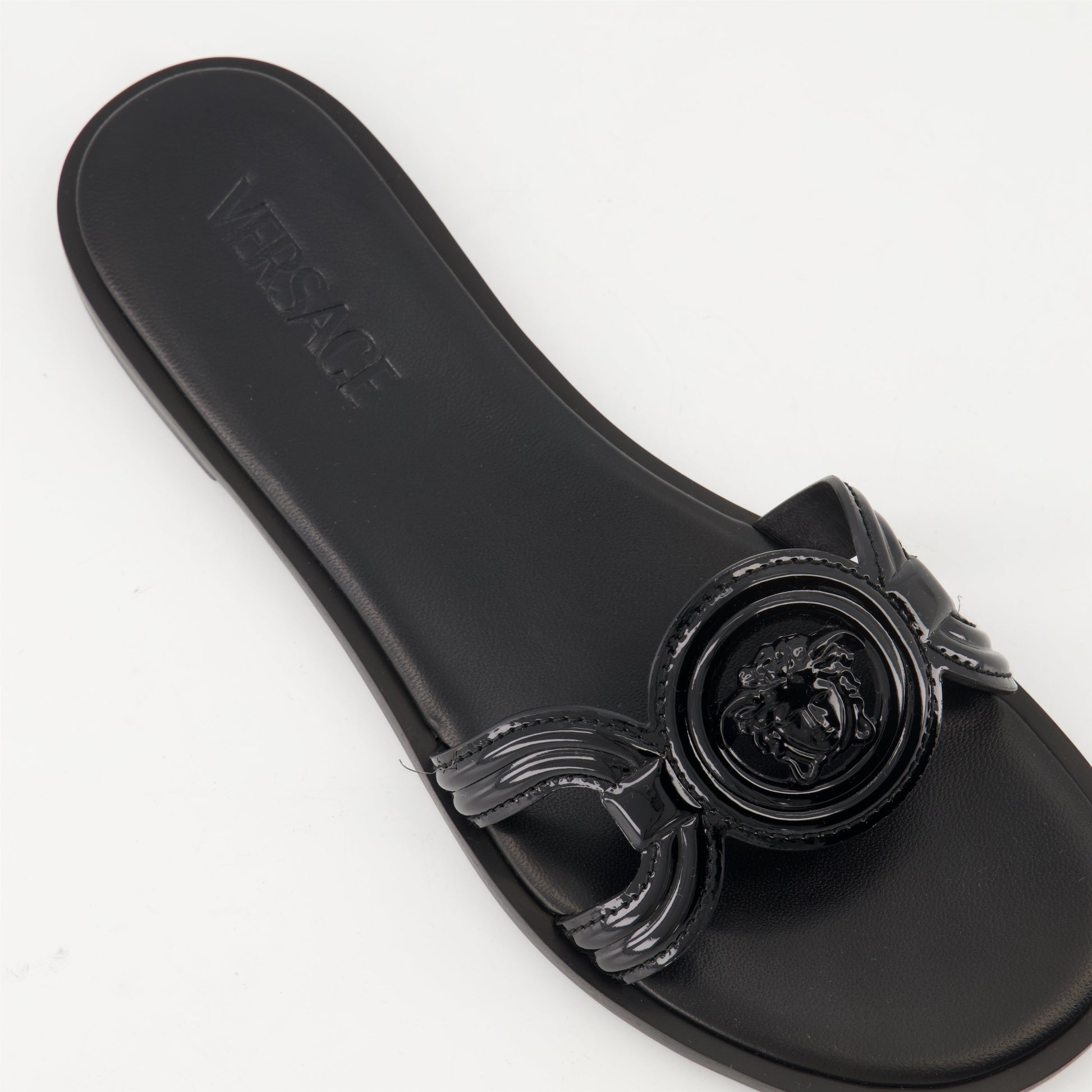 Step into sophistication with the Medusa '95 black leather slides. Crafted from shiny leather, these slides embody timeless elegance with their round open toe and a refined slip-on silhouette. The distinctive Medusa '95 motif adds a touch of unique style, while the leather sole ensures lasting comfort. Ideal for casual outings or relaxed moments, these slides resonate with understated refinement.