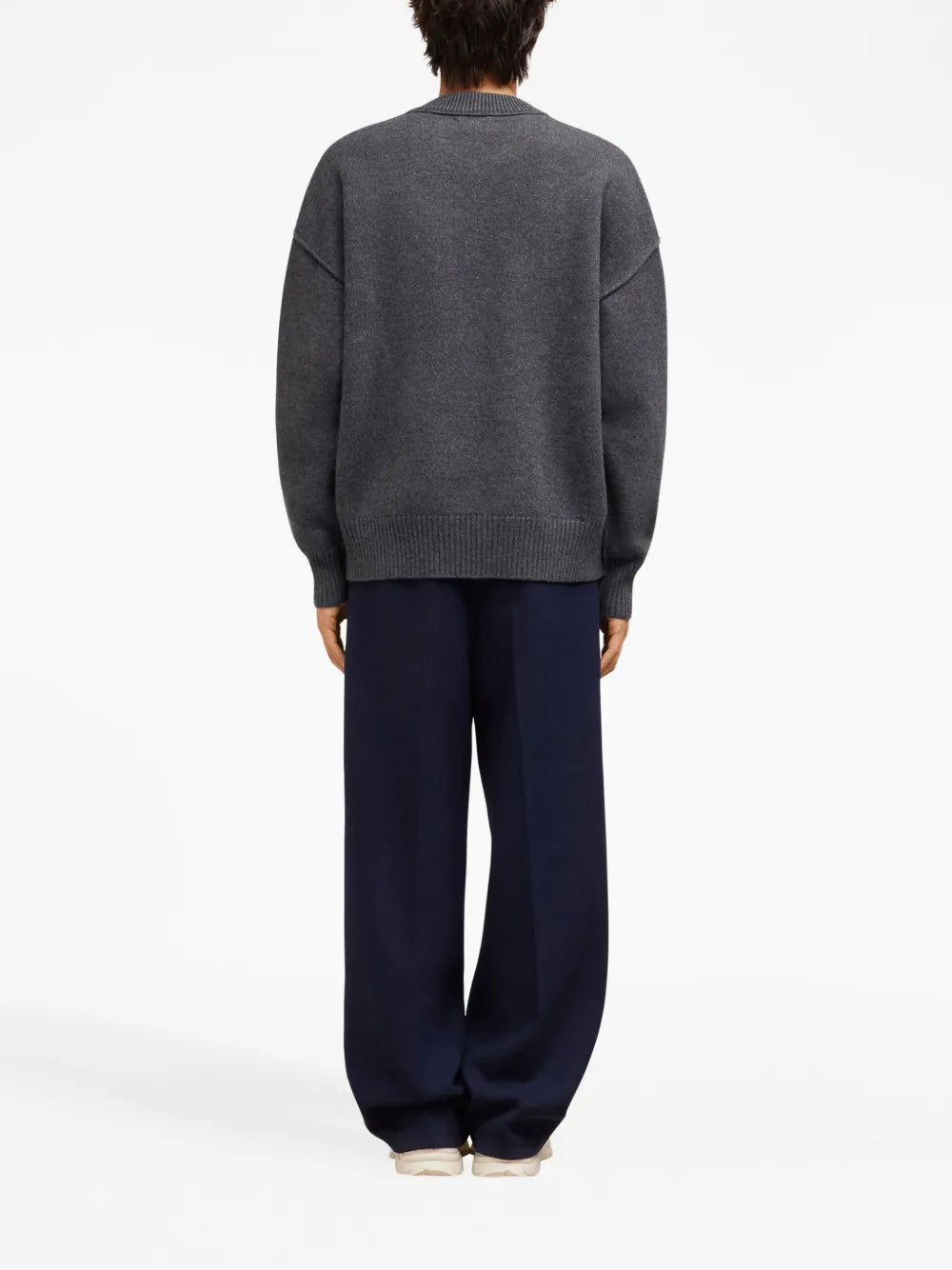 The Ami de Coeur red heart knit sweater is a remarkable addition to your wardrobe, seamlessly blending comfort with contemporary style. Crafted in a soft wool blend, this unisex sweater features a classic crew neck and long sleeves, complemented by ribbed edges. The striking red heart logo adds a charming focal point against the dark grey fabric, making it a versatile piece for various occasions. With its straight-cut design, it offers a relaxed fit that enhances your silhouette.