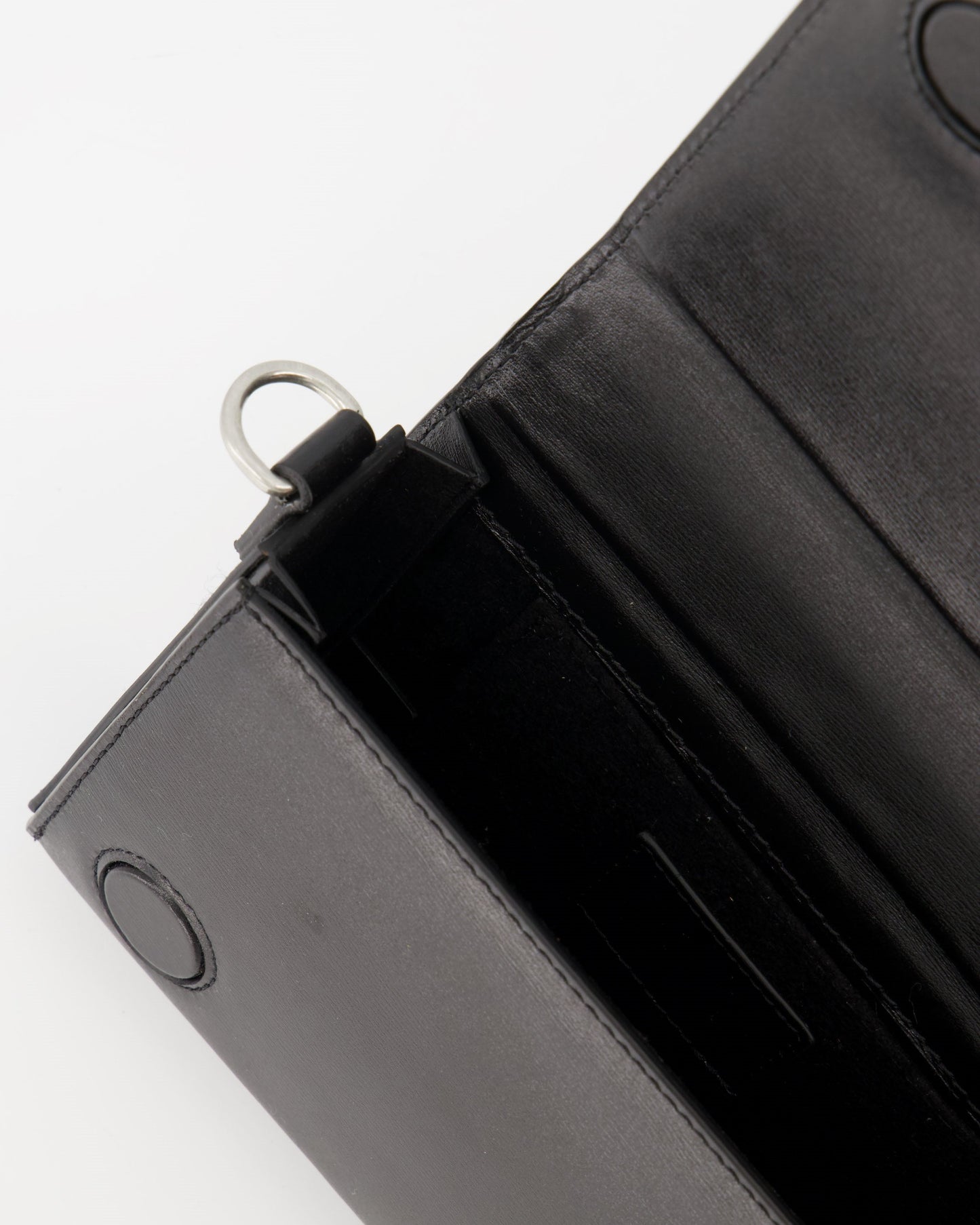 El bolso Lunch Box de cuero negro de AMI Paris encarna la sofisticación con su diseño atemporal y detalles cuidadosamente pensados. Confeccionado en piel de vaca suave, este modelo unisex presenta un cierre magnético único y una correa de hombro de cuero desmontable, lo que le añade versatilidad a su atractivo. El interior cuenta con un solo compartimento forrado en ante, realzando la estética refinada del bolso. Terminado con un remache de metal en tono plateado del Ami de Coeur, este bolso es una opción elegante para todos. Eleva tu colección de accesorios con esta pieza esencial, perfecta para ocasiones tanto casuales como formales.