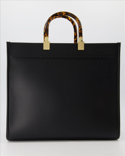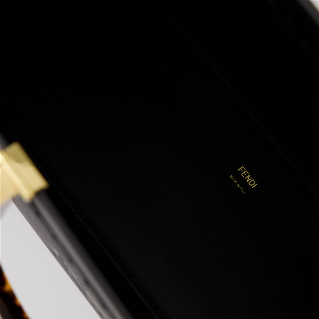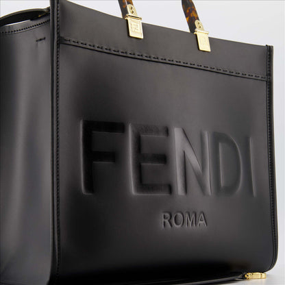 Descubre el bolso tote Sunshine de la prestigiosa marca Fendi, diseñado para la mujer elegante que busca un accesorio tanto práctico como refinado. Este espacioso bolso negro muestra con orgullo el logo 'Fendi Roma' grabado en su superficie, añadiendo un toque de lujo a tu look diario. Las asas de plexiglás con efecto carey aportan un toque original, mientras que la correa de hombro de cuero ajustable y removible ofrece varias opciones de transporte. Con bordes de cuero tonal y detalles de latón dorado, el bolso tote Sunshine es la mezcla perfecta de funcionalidad y diseño de alta gama.