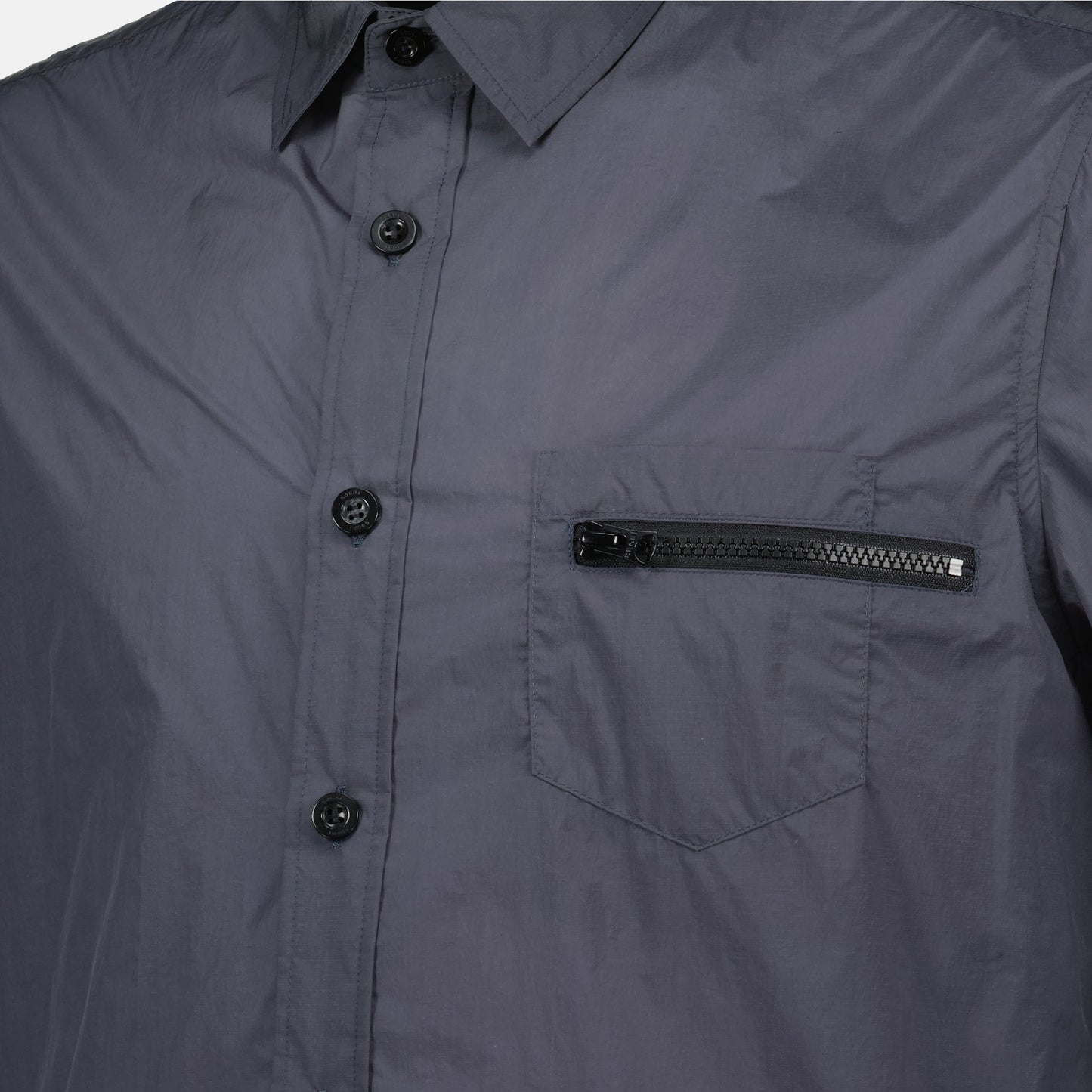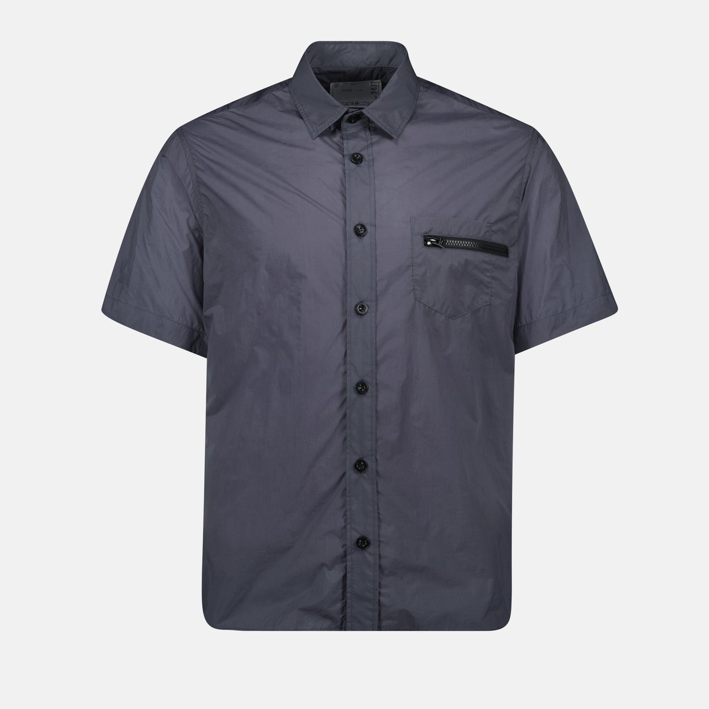 Eleva tu guardarropa con esta camisa de nylon azul-gris de la prestigiosa marca Sacai. Diseñada para la colección Primavera-Verano 2025, presenta un collar clásico, mangas cortas y una silueta recta que equilibra a la perfección estilo y comodidad.