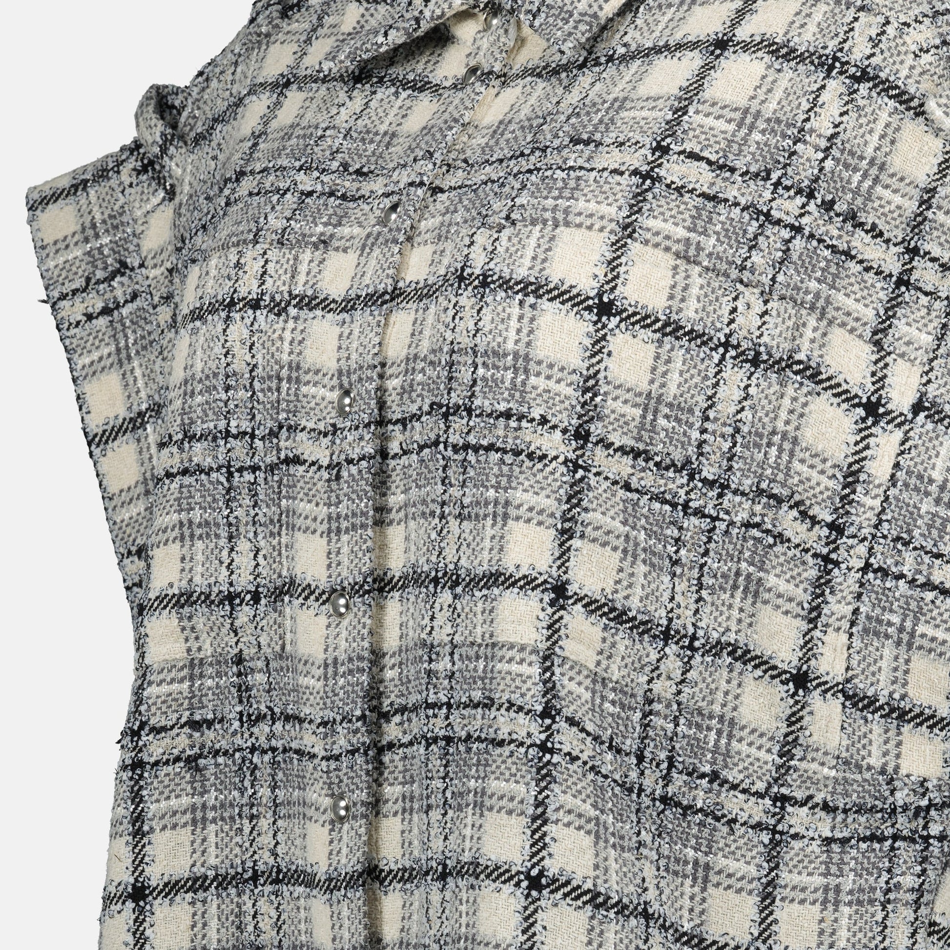 Eleva tu guardarropa de temporada con la camisa de tweed Samie de Iro. Elaborada con tweed de alta calidad, esta prenda presenta un clásico patrón de cuadros que realza su atractivo. Cuenta con un cuello clásico, mangas cortas y un cierre práctico de botones a presión para mayor comodidad. El diseño incluye bolsillos laterales de parche y elegantes lazos en los hombros, junto con recortes frontales únicos que agregan un toque interesante. Ideal para superponer o usar por sí sola, esta camisa se alinea perfectamente con las tendencias de moda contemporáneas.
