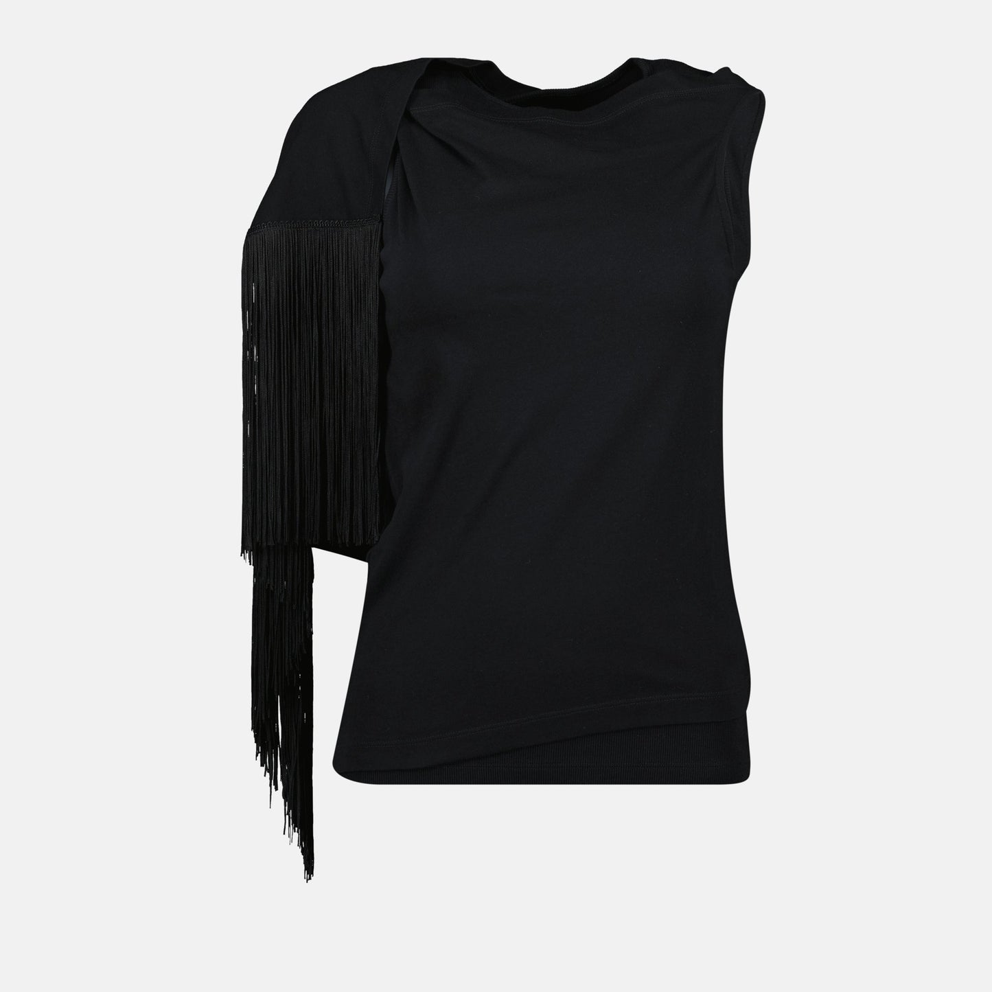 Descubre la esencia de la elegancia discreta con la camiseta de algodón negra con flecos de MM6. Esta prenda cautiva con su exclusiva mezcla de elementos de diseño sutiles y materiales premium, elaborada con precisión para el entusiasta de la moda exigente. Destacada por un elegante escote redondo y mangas cortas, esta camiseta cuenta con un diseño distintivo de doble capa, completada con detalles de flecos que añaden un toque de dinamismo. La camiseta viene en un clásico negro, ofreciendo tanto versatilidad como sofisticación, y es parte de la codiciada colección de Primavera-Verano 2025 de MM6. Fabricada en algodón de alta calidad, garantiza comodidad mientras proporciona un look llamativo perfecto para cualquier ocasión estilosa.