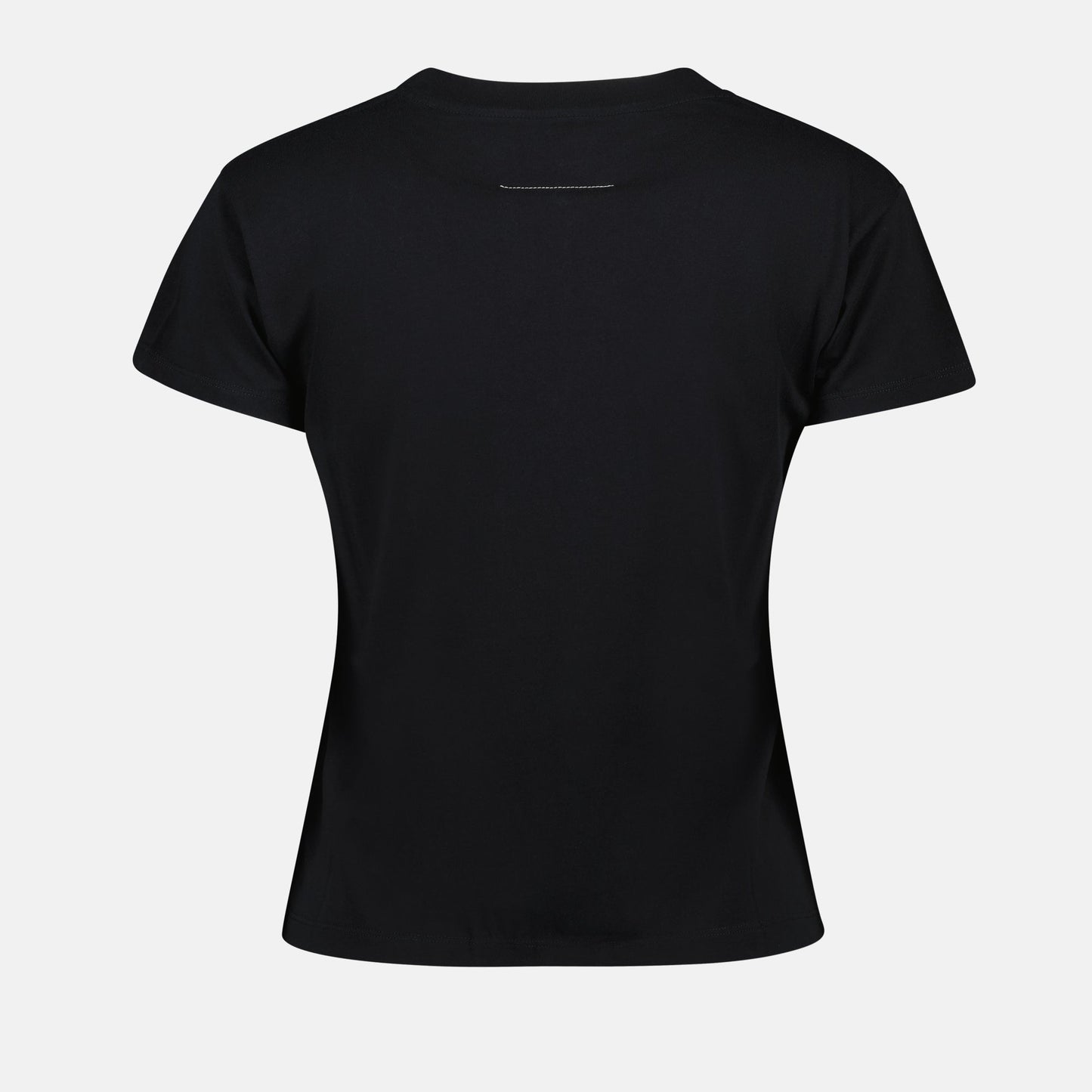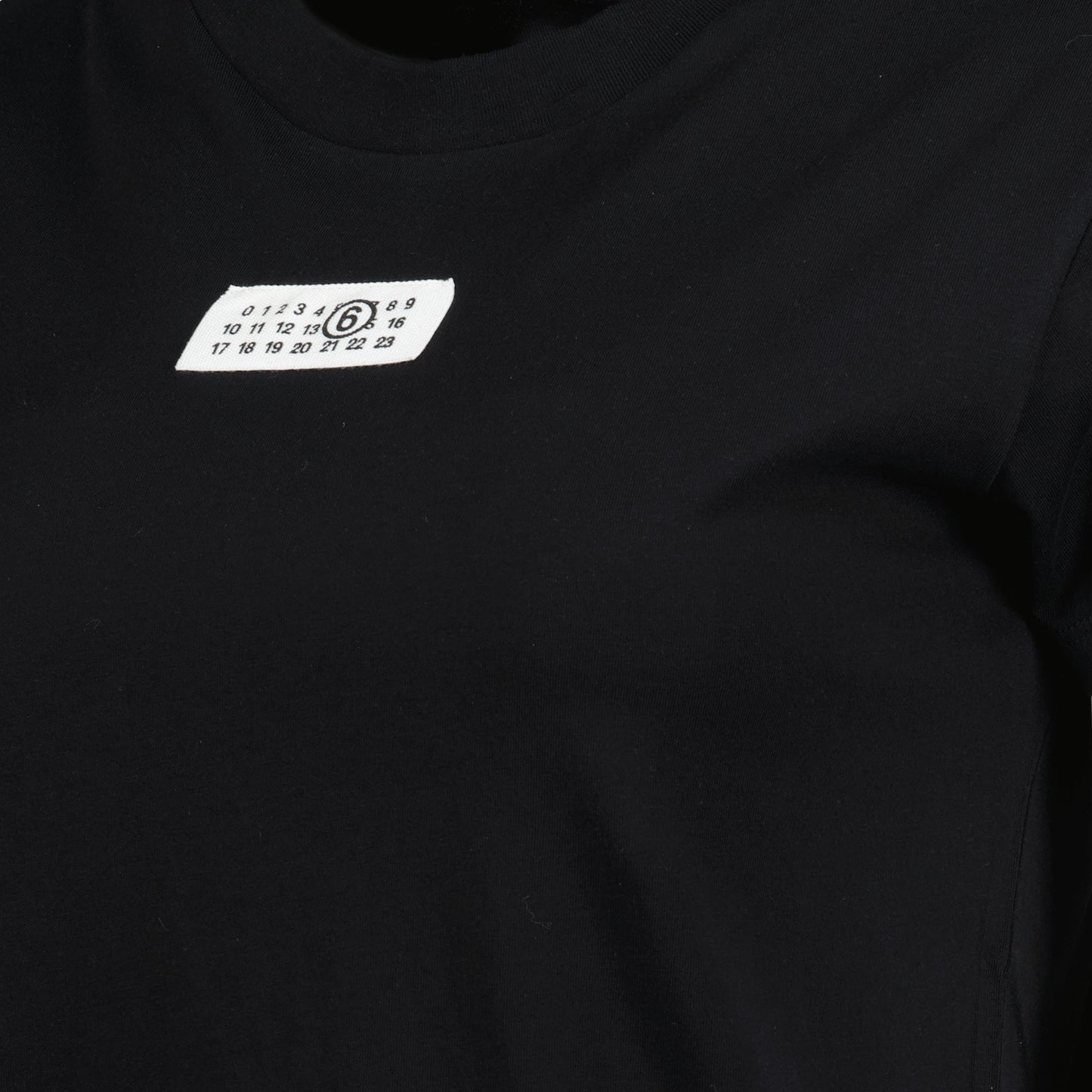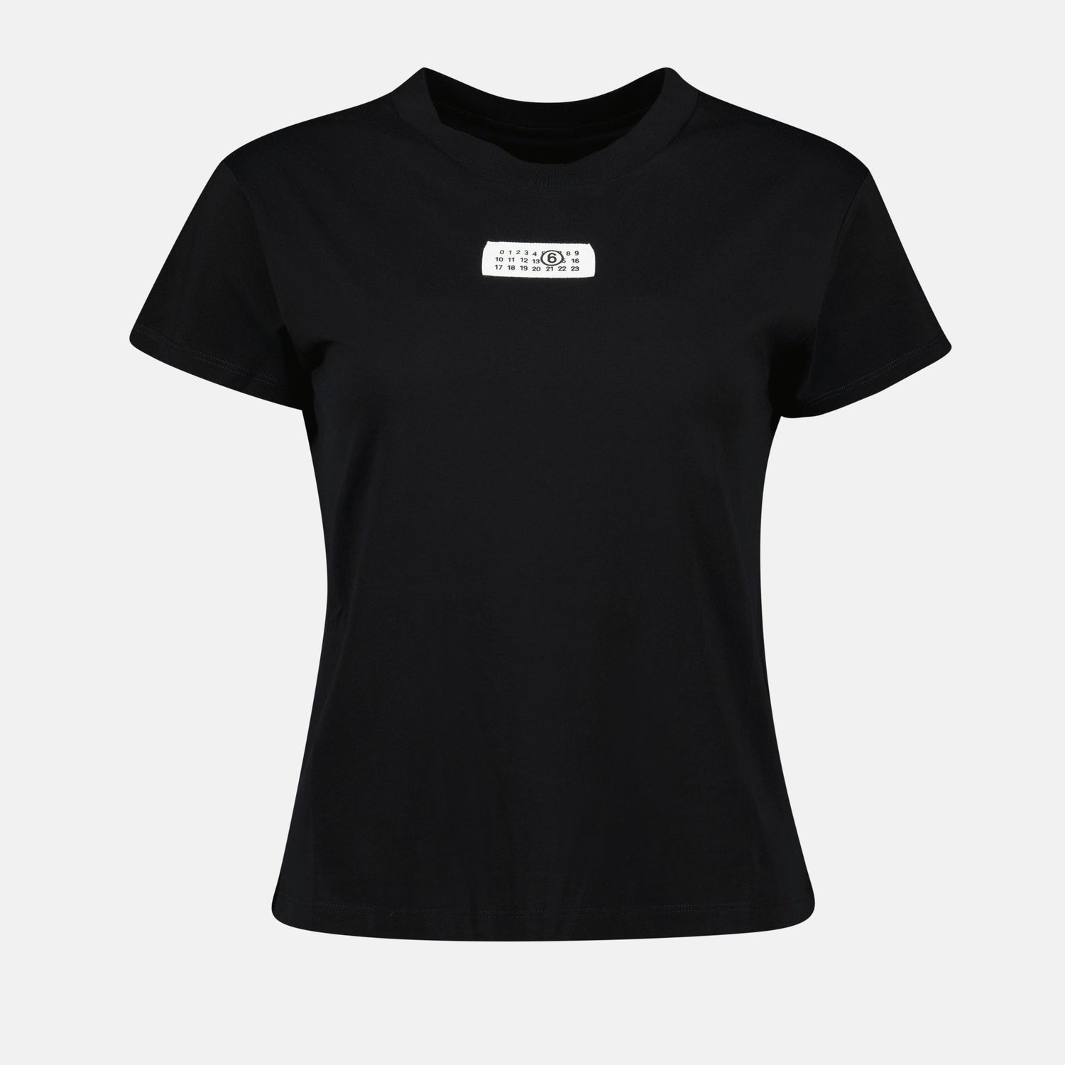 Presentamos la camiseta de algodón negra con numérico de MM6, una adición exquisita a tu guardarropa de la colección Primavera-Verano 2025. Esta pieza elegantemente diseñada cuenta con un clásico escote redondo y mangas cortas, creando un look chic sin esfuerzo. El ajuste cropped acentúa tu silueta, mientras que el suave jersey de algodón garantiza comodidad y estilo. Una firma numérica decora el frente, añadiendo un toque distintivo, y la línea de costura blanca distingue la parte posterior. Adopta esta pieza versátil, diseñada para satisfacer las demandas estéticas modernas y elevar tu conjunto diario.