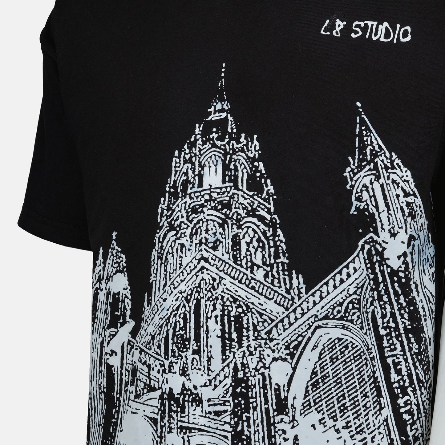 Presentamos la Camiseta con Estampado de Catedral de L8 Studio, confeccionada en suave algodón para una comodidad absoluta. Esta pieza distintiva exhibe un impactante gráfico de catedral y cuenta con un corte relajado y oversized que aporta modernidad a tu guardarropa.