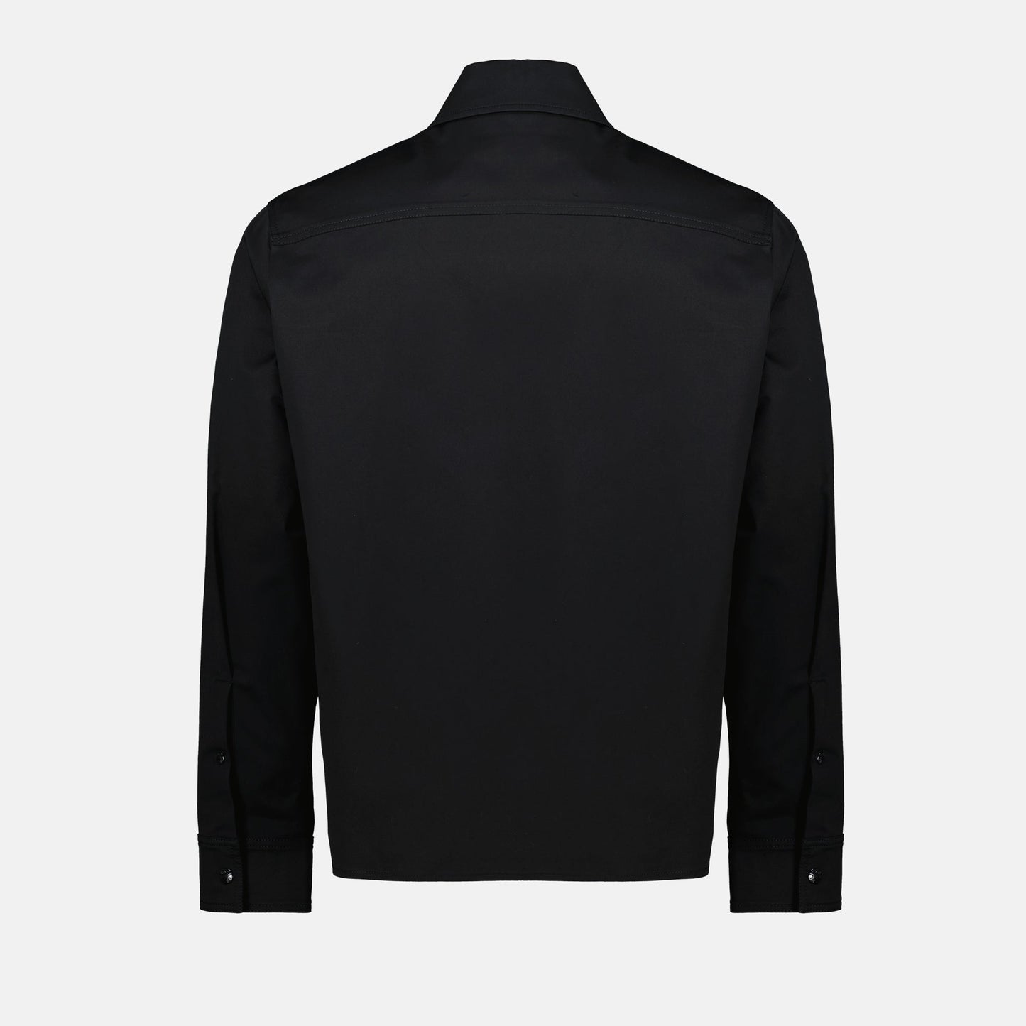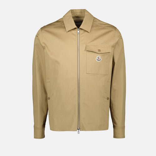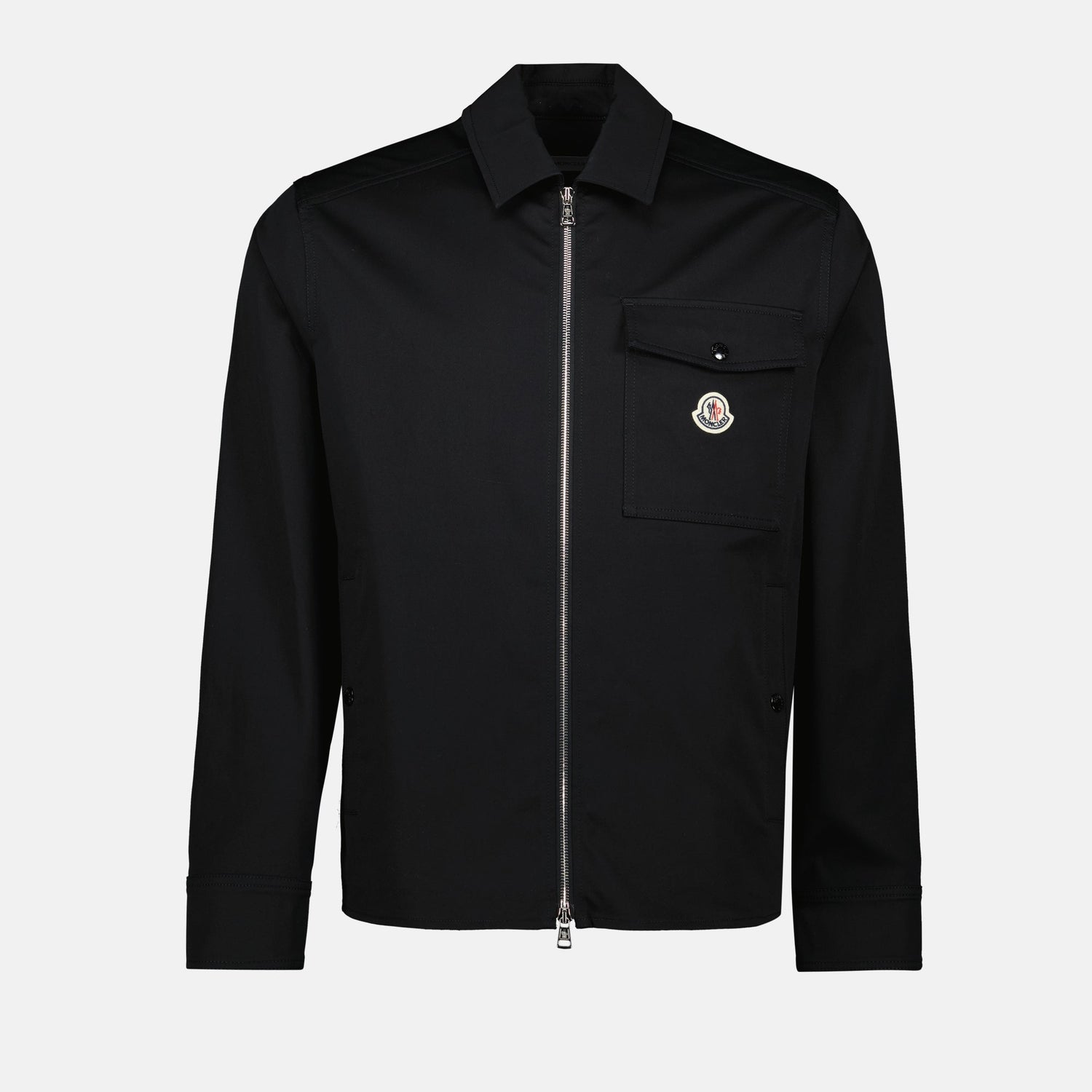 Descubre el elegante atractivo de esta chaqueta de camisa negra, diseñada con un collar clásico y con un cierre de doble cremallera para un toque moderno. Confeccionada con una mezcla de algodón y elastano, esta prenda asegura un ajuste cómodo mientras irradia un estilo refinado. La chaqueta incluye prácticos bolsillos laterales inclinados y un bolsillo de solapa en la parte delantera, que exhibe el icónico logo de Moncler en suave fieltro. Es una adición versátil a tu armario, que se adapta sin esfuerzo de un estilo casual a uno más pulido.