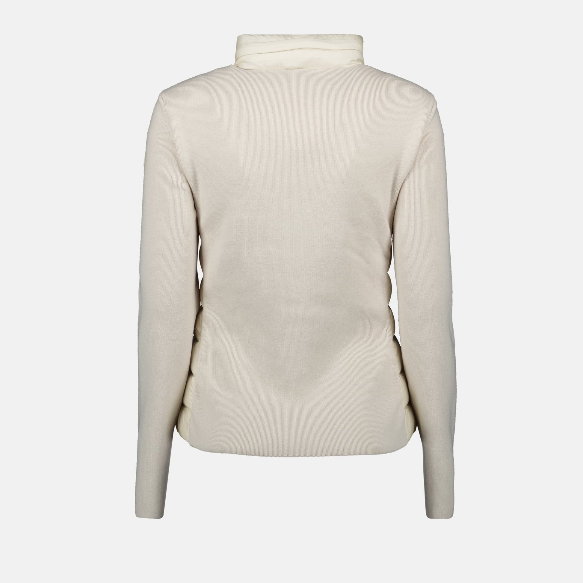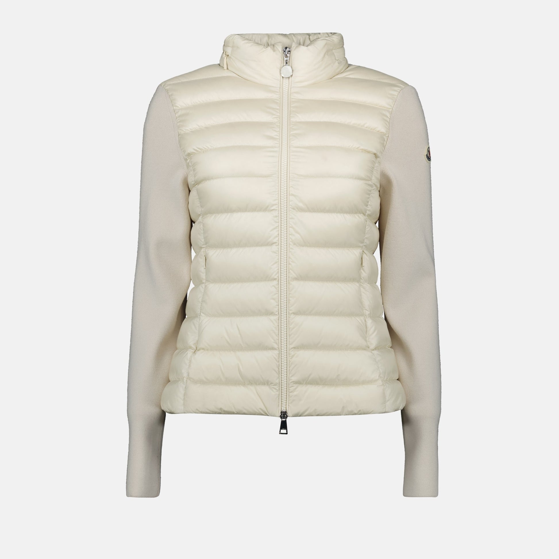 Esta chaqueta de plumas blanca de bi-material combina estética refinada con un diseño práctico, convirtiéndola en una adición versátil a tu guardarropa. Fabricada con nylon de alta calidad y lana merino elástica ultra-fina, cuenta con un cuello alto, mangas largas y un cierre de doble cremallera para facilitar su uso. Con bordes acanalados y bolsillos laterales con cremallera, equilibra funcionalidad y estilo sin esfuerzo. El icónico logo de Moncler en fieltro en la manga añade un toque de distinción. Ideal para superponer o como una pieza de declaración por sí sola, esta chaqueta está diseñada para realzar tu look mientras proporciona calidez y comodidad.