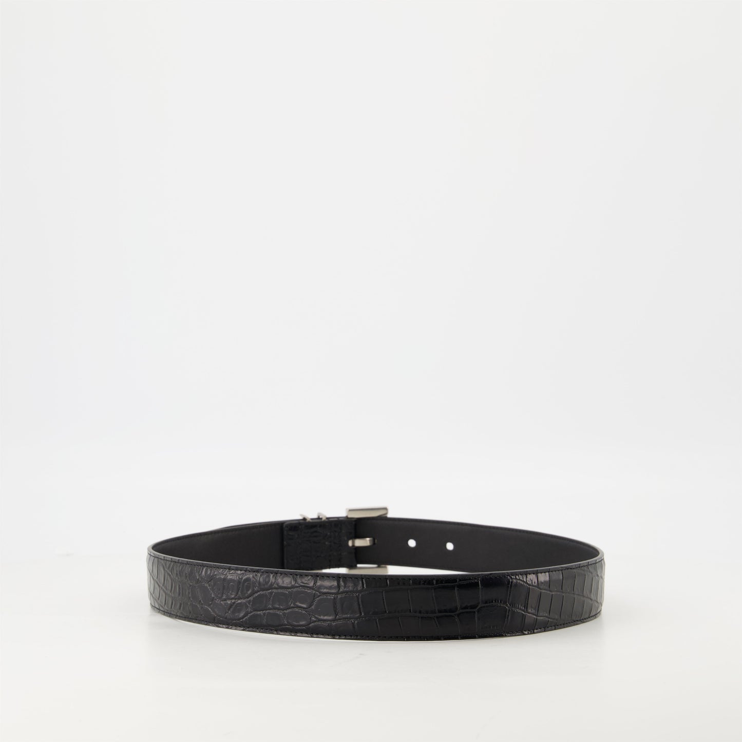 El Cinturón de Cuero con Efecto Croc Cassandre es una pieza impactante que encarna la sofisticación. Elaborado con cuero de alta calidad con efecto croc, presenta una hebilla moderna adornada con letras metálicas, que aporta un toque contemporáneo. Su tamaño ajustable garantiza comodidad, y el elegante color negro lo hace lo suficientemente versátil para llevar con varios atuendos. Destacando los icónicos elementos de diseño de YSL y terminado con acentos en tono plateado, este cinturón es perfecto para añadir un detalle refinado tanto a looks casuales como formales. Descubre una pieza que realza tu colección sin esfuerzo.