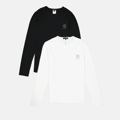 Presentamos el conjunto de bodies de punto Medusa para el individuo exigente que busca la elegancia en la simplicidad. Este conjunto incluye dos piezas impecablemente confeccionadas: una en un llamativo negro y otra en un blanco atemporal. Diseñadas con un escote redondo refinado y mangas largas, las prendas aseguran una apariencia sofisticada. El discreto logo de la marca añade un toque de distinción. Construidos con una mezcla premium de algodón y elastano, estos bodies de la colección Otoño-Invierno 2024 de Versace prometen comodidad y un ajuste favorecedor.