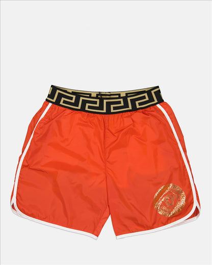 Los bañadores Greca de Versace para niños son el aliado perfecto para días soleados y elegantes. Su vibrante color rojo atrae las miradas, mientras que la franja dorada Greca añade un toque de lujo emblemático de la marca. Prácticos y cómodos con su cintura elástica, estos shorts también son fáciles de poner y quitar. Confeccionados en nylon de alta calidad, garantizan una excelente resistencia al cloro y al desgaste para un uso prolongado. Un sutil ribete blanco contrasta con el rojo para un efecto visual llamativo. Comprometidos con respetar la silueta juvenil, estos shorts presentan un corte relajado y acampanado que ofrece total libertad de movimiento, ya sea para nadar o jugar en la playa. Los logos brillantes añaden un toque final de prestigio, asegurando que tu hijo destaque junto a la piscina o en la playa.