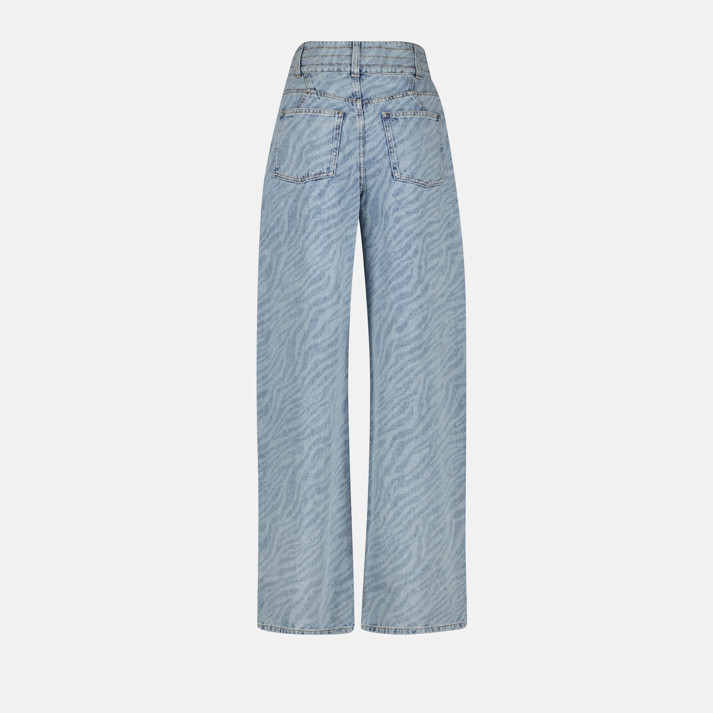 Adopta un estilo contemporáneo con estos jeans de pierna ancha que presentan un llamativo estampado de cebra azul claro. El favorecedor diseño de talle alto se combina con una construcción clásica de cinco bolsillos, asegurando tanto moda como funcionalidad. Confeccionados en suave denim de algodón, estos jeans prometen comodidad y versatilidad para tu armario diario. Una elección audaz que combina perfectamente con una blusa ajustada o la chaqueta a juego, mostrando un aire sofisticado y relajado.
