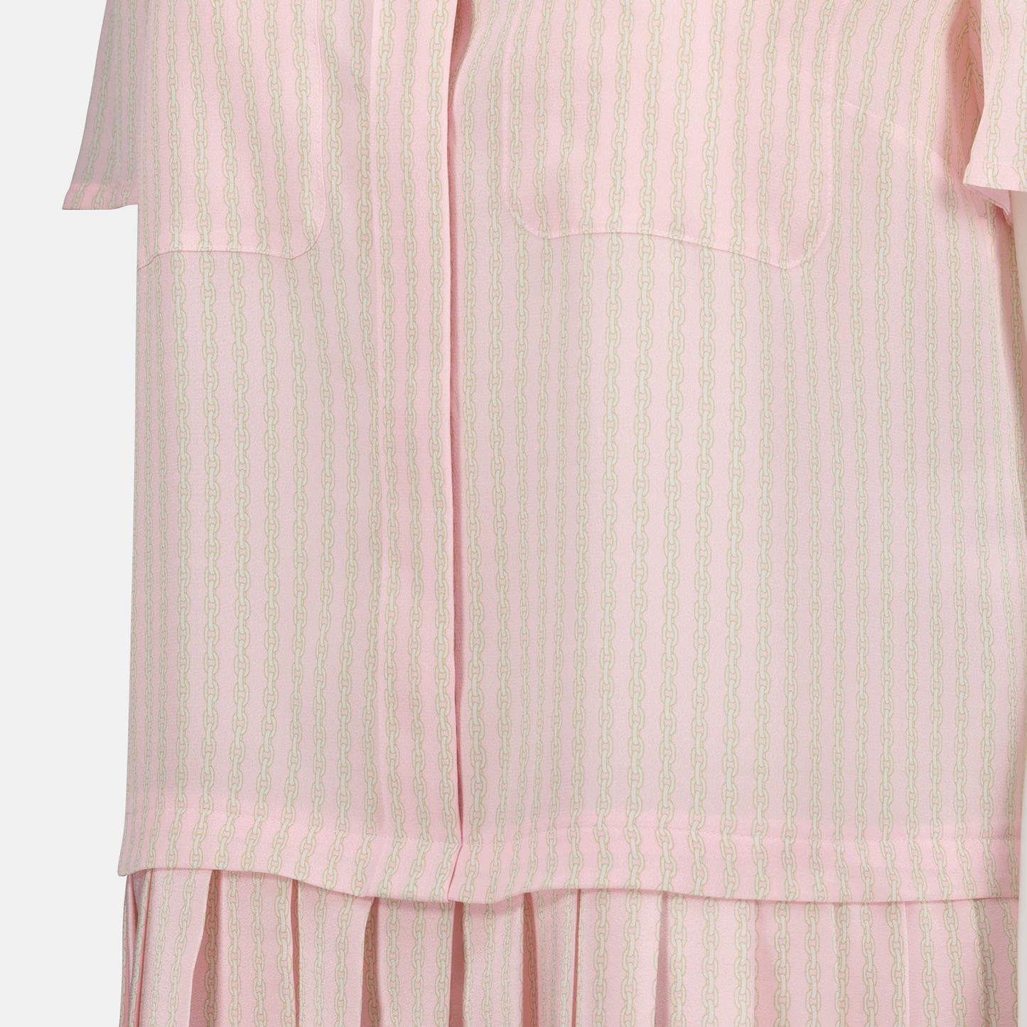 Adopta un estilo sin esfuerzo con este exquisito vestido camisa de seda rosa de Versace, elaborado en delicado crêpe de Chine. Con un cuello clásico y mangas cortas, esta pieza fluye elegantemente hacia una silueta larga, complementada por una tapeta de botones oculta y cómodos bolsillos laterales. El vestido destaca por un llamativo patrón de rayas Chain y cuenta con una falda plisada, que añade un toque de movimiento y gracia. Terminada con un botón de metal Medusa, esta prenda encarna un estilo contemporáneo y un diseño refinado.