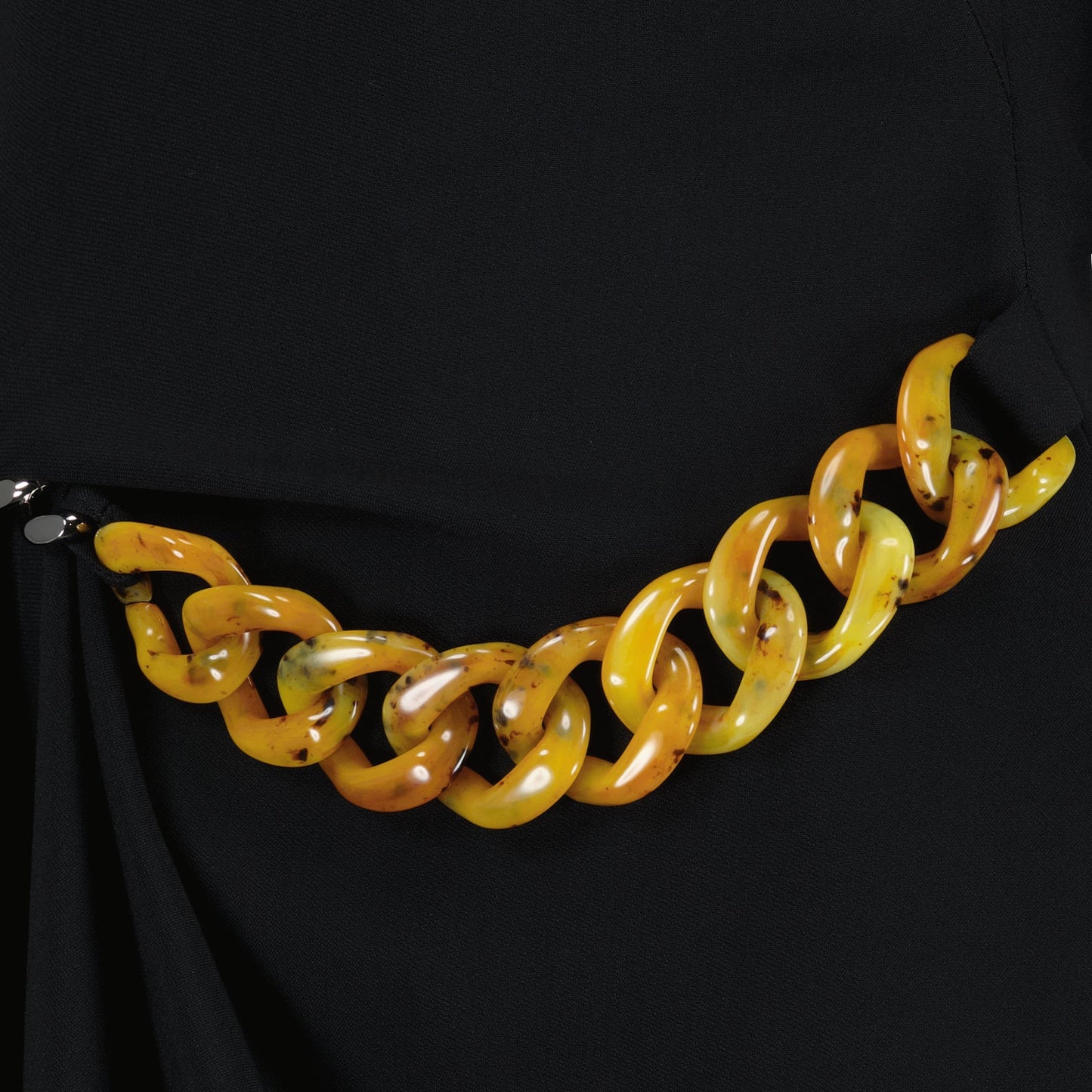 Descubre la elegante sofisticación del vestido Falabella, una pieza destacada diseñada con un cuello redondo y mangas tres cuartos. Su corte recto se complementa con un cierre de cremallera discreto, mientras que el exquisito detalle de cadena en oro y plata en la cintura añade un toque distintivo. Confeccionado en suave viscosa, este vestido encarna comodidad y estilo, ideal tanto para el día como para la noche.