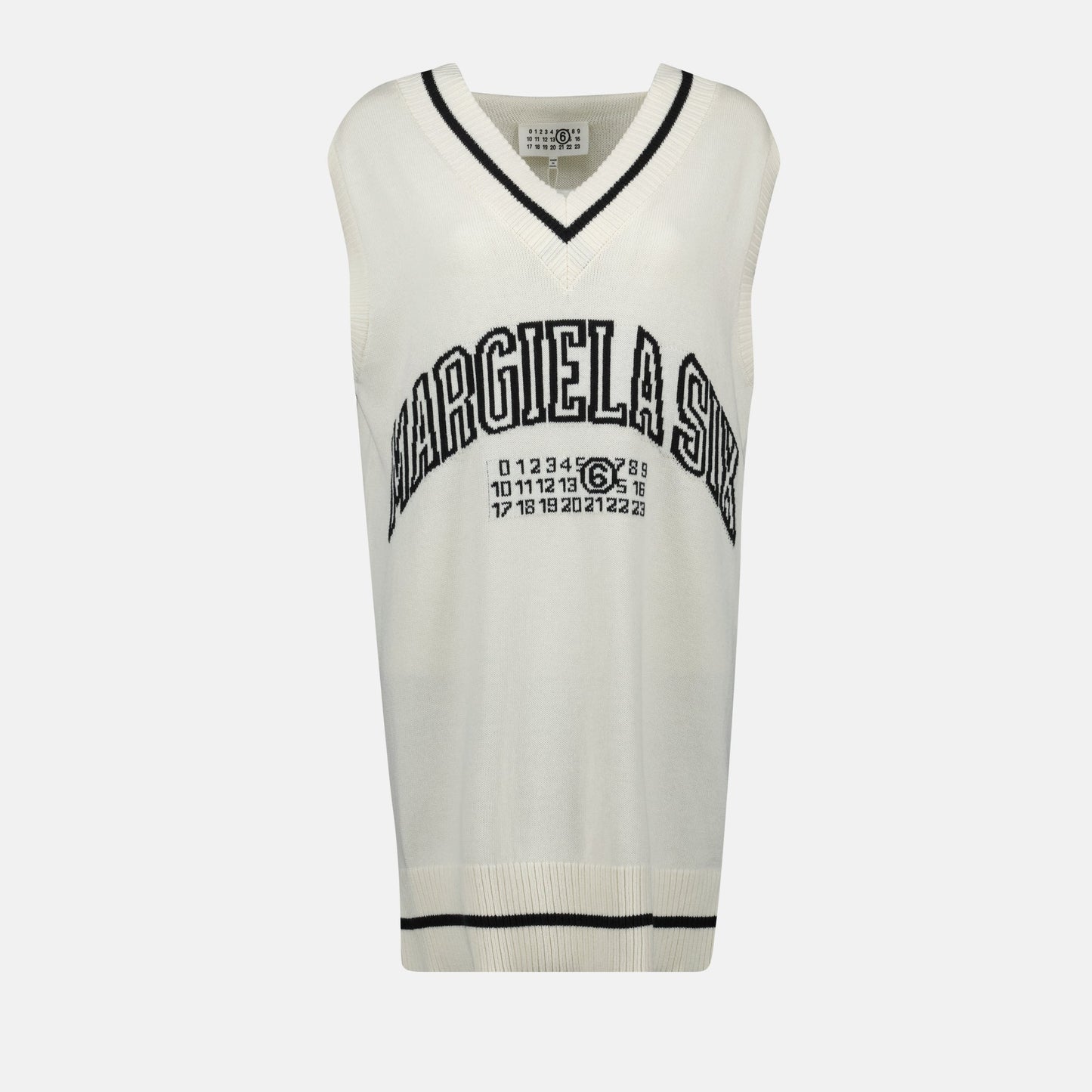 Este vestido de punto sin mangas es una pieza refinada de MM6, diseñado con un favorecedor escote en V y corte recto para realzar tu silueta. Presentado en un suave tono blanco roto, está confeccionado en lana de primera calidad para un ajuste acogedor y elegante. La bufanda discreta añade un toque de sofisticación, mientras que el logotipo One Stitch y los detalles de costura negra aportan un giro moderno. Ideal para las temporadas de transición, este vestido versátil combina a la perfección con tus accesorios favoritos.