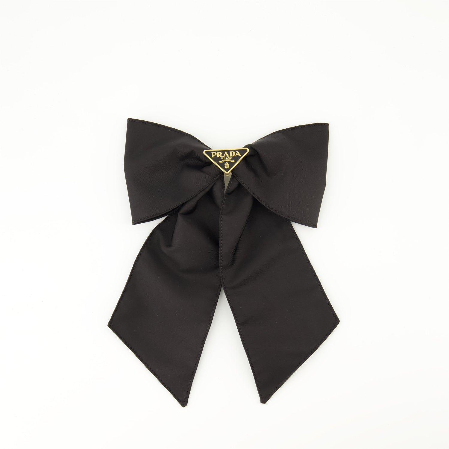 Améliorez votre collection d'accessoires avec l'exquise barrette Noeud Re-Nylon de Prada, une addition élégante confectionnée en nylon recyclé noir. Cette barrette unique présente un délicat design en forme de noeud, complété par un logo triangulaire en émail signature, alliant sophistication et durabilité. Idéale pour ajouter une touche raffinée à n'importe quelle coiffure, cette pièce fait partie de la collection Printemps-Été 2025 de Prada et incarne l'élégance moderne.