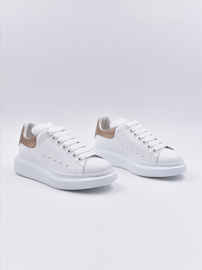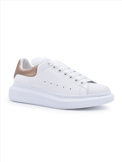 Adoptez l'élégance avec les Alexander McQueen Women's Oversize Leather Sneakers, une véritable incarnation du luxe et du style contemporain. Confectionnées en cuir blanc immaculé, ces sneakers arborent un surprenant empiècement talon rose doré qui ajoute une touche de glamour à chacun de vos pas. La semelle oversize offre non seulement du confort mais aussi une silhouette unique qui distingue ces sneakers de l'ordinaire.