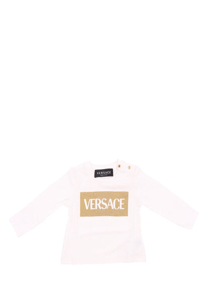 Offrez à votre enfant une touche de luxe avec ce t-shirt à manches longues imprimé par Versace. La pièce se distingue par son logo iconique imprimé en blanc sur un fond doré scintillant, ajoutant une touche étincelante à la garde-robe de votre petit.