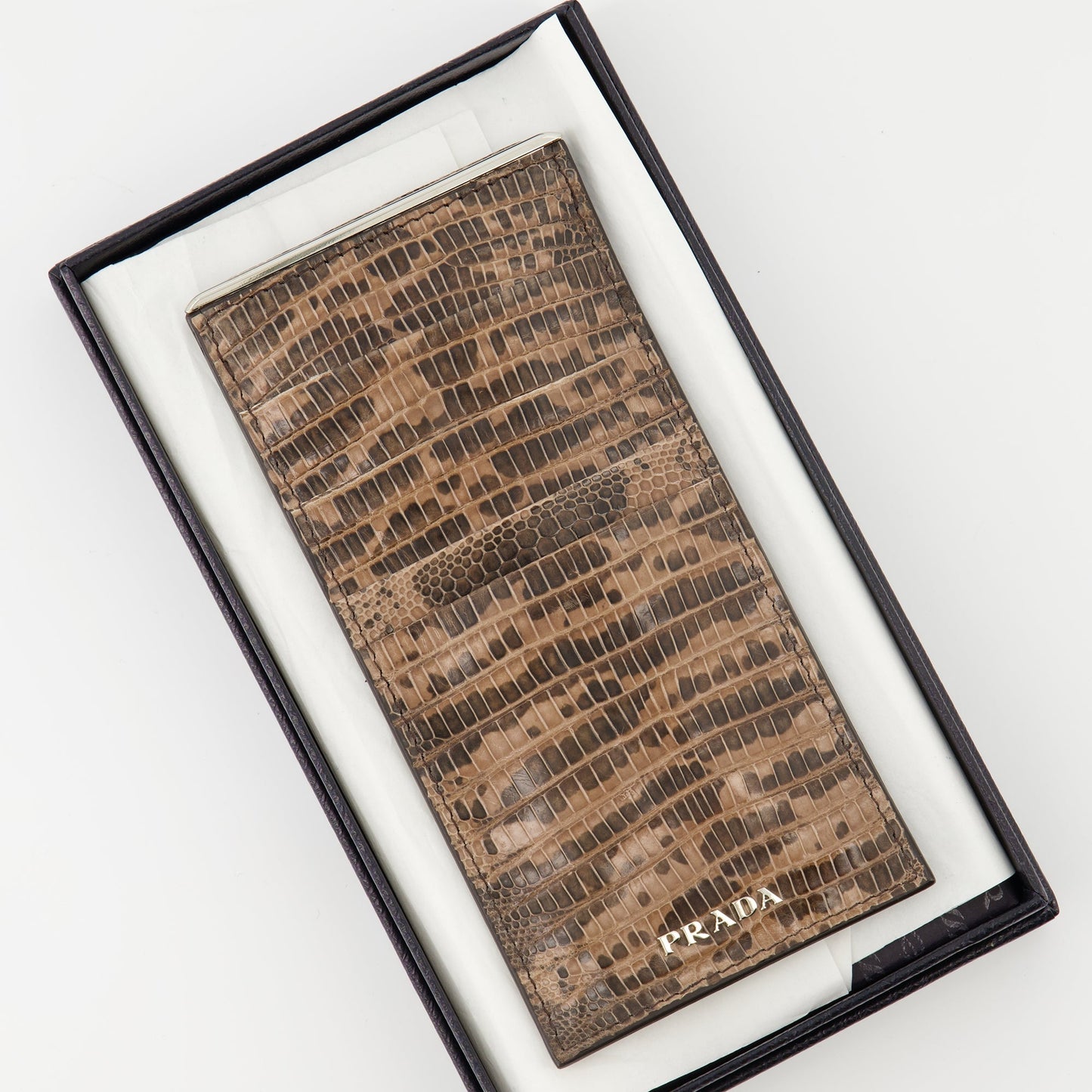 プラダの贅沢なブラウンレザー製パイソンエフェクトカードホルダーをご紹介します。このエレガントなアクセサリーにはカード用のスロットが複数あり、現金用の専用 compartmentsも備えており、スタイルと機能性が日常のニーズを満たします。微妙なパイソンシン効果が洗練された雰囲気を演出し、コレクションにぴったりなアイテムです。コンパクトでありながら広々としたこの作品は、形と機能を見事に融合させ、あなたの必需品を常に完璧に整理します。