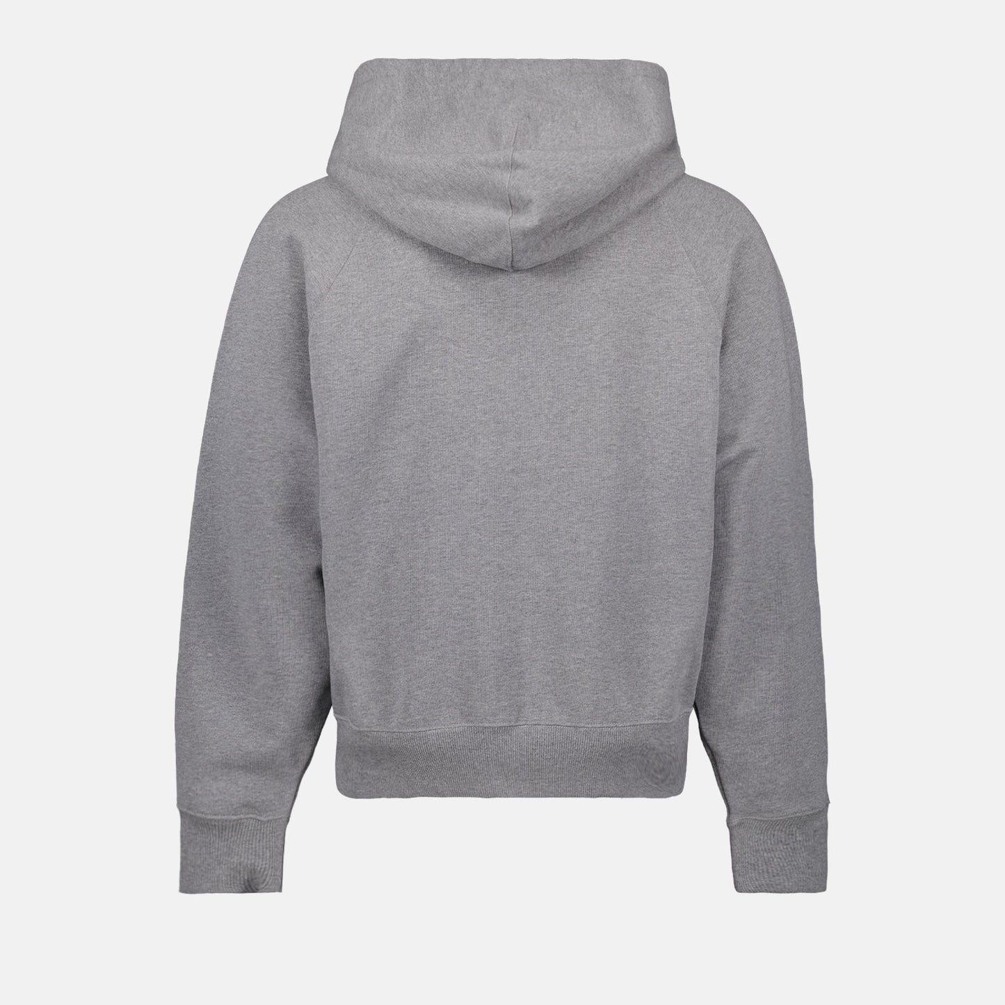 このグレーのジップスウェットシャツでカジュアルな装いを格上げしましょう。リラックスしたフィット感で、ラウンドネックと長袖を備えています。快適なシルエットを提供します。フードは調整可能で、完璧なフィット感を確保でき、スラントサイドポケットがこのスタイリッシュなアイテムに実用性を加えます。胸元には、赤いAmi de Coeurのロゴがエレガントに刺繍されており、シグネチャースタイルを演出しています。柔らかいオーガニックコットンで作られたこのユニセックスモデルは、快適さと現代的なファッションが見事に融合しています。