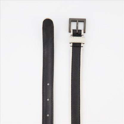 Prada의 투톤 사피아노 가죽 벨트로 스타일을 완성하세요. 이 세련된 아이템은 허리를 강조하면서 모든 의상에 우아한 터치를 더해줍니다.