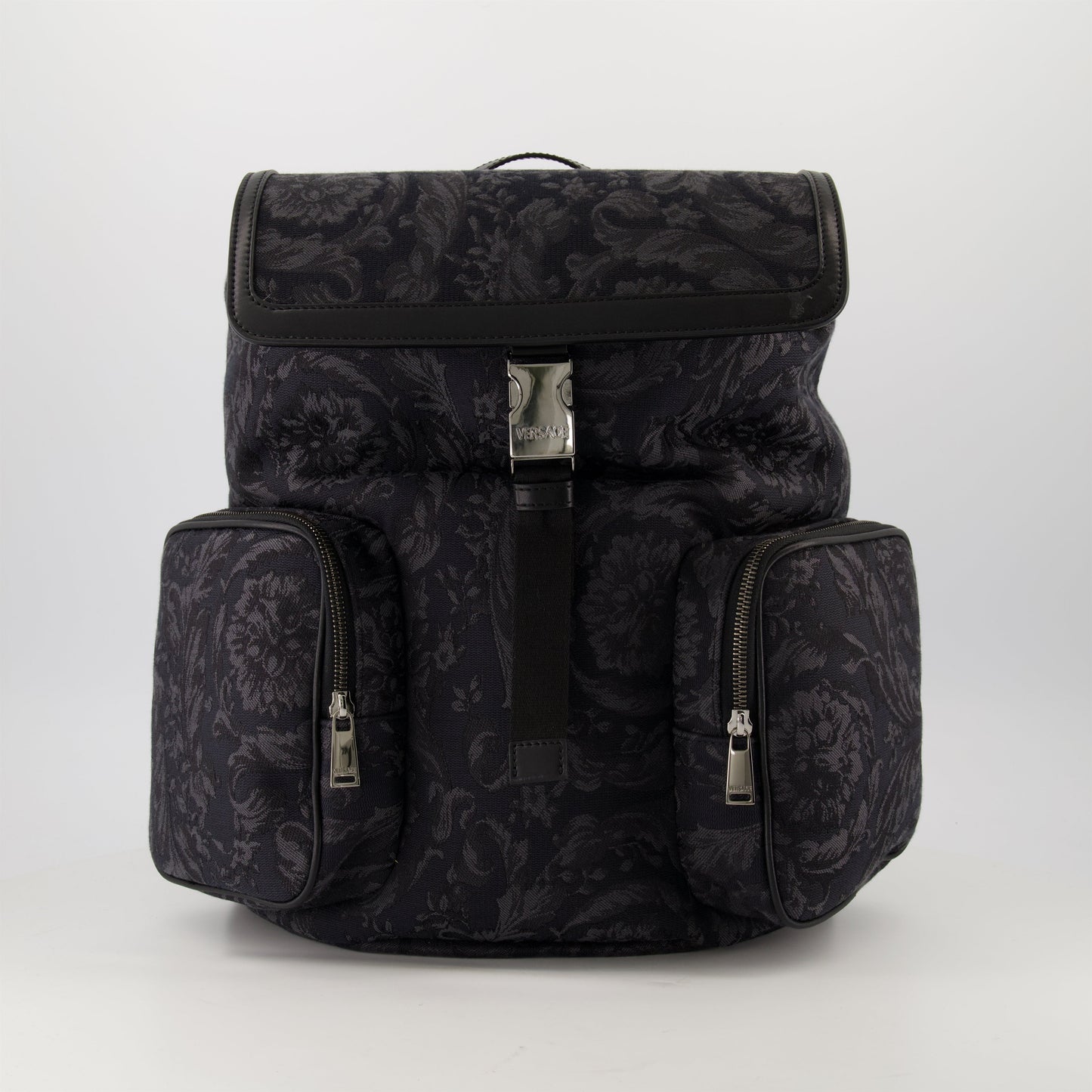 Embrace effortless sophistication with the Barocco black backpack. Meticulously crafted from durable polyester and cotton, this accessory showcases a striking Barocco neo jacquard print, adding a distinctive touch to your everyday ensemble. Its practical design features adjustable straps, a secure top handle, and zippered side pockets for effortless organization. The embossed logo and leather detailing enhance its refined aesthetic. Ideal for both urban exploration and casual outings, this backpack combines style with functionality.