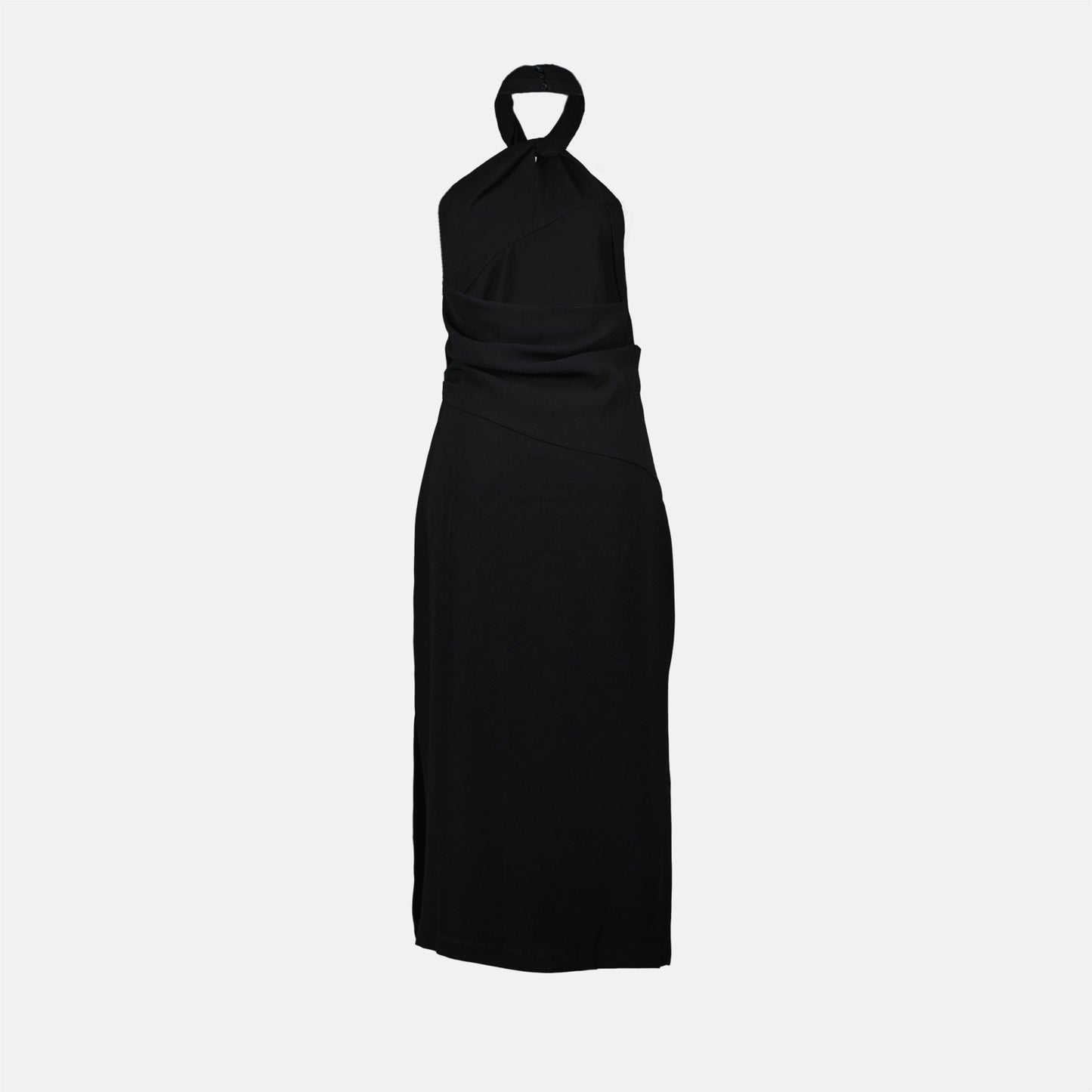 Introducing the Black Barana Dress, a refined piece that embodies modern elegance. This dress features a chic sleeveless silhouette with a crafted neckline adorned with buttons. The long cut, complemented by a discreet zip closure, ensures a flattering fit, while the striking front slit adds a touch of allure.