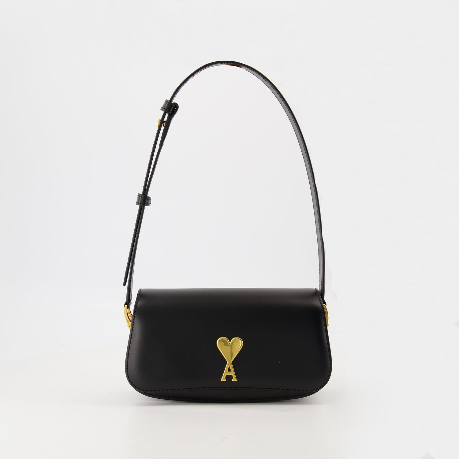 Introducing the Black Leather Paris Baguette Bag from AMI, a perfect blend of style and functionality. Crafted from soft Box leather, this versatile unisex bag showcases an elegant black exterior highlighted by refined brass-colored metallic accents. The design features a magnetic closure that ensures your belongings are secure while adding a touch of sophistication.
