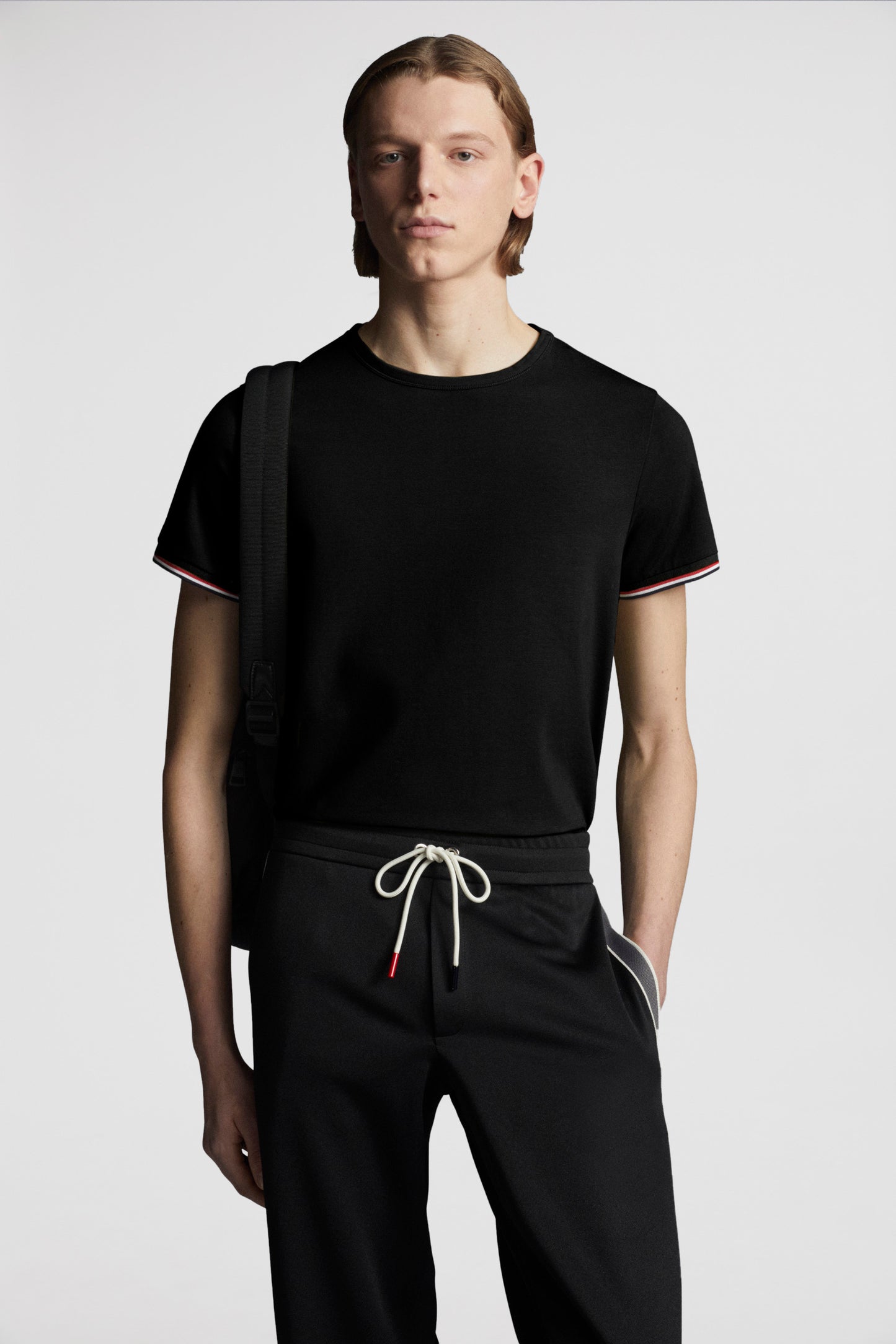 Embrace elegance and contemporary style with this Black Logo Trim T-shirt from Moncler. Crafted from high-quality materials, this T-shirt showcases the brand's iconic logo subtly integrated into the design. The sleek black hue is complemented by refined trim details that lend a touch of sophistication to your casual wardrobe.