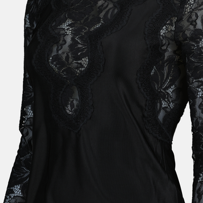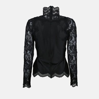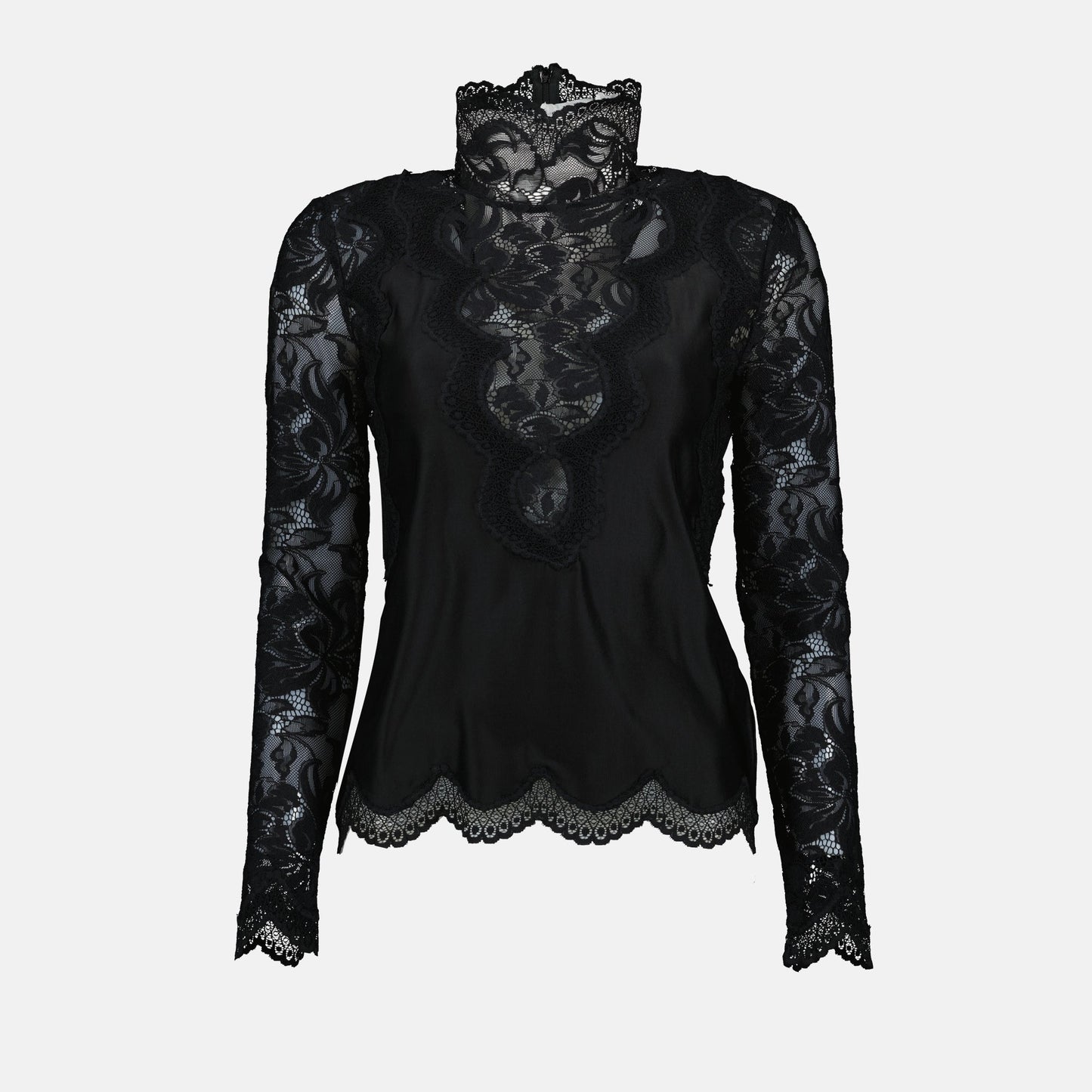 This black blouse seamlessly combines the soft allure of satin with delicate lace accents, making it an essential addition to your wardrobe. Designed with a high collar and long sleeves, it features a button closure and a logo tag, ensuring a refined look for any occasion. The beautiful embroidered lace detailing adds a touch of femininity, making this piece perfect for both casual outings and more formal events. Embrace timeless style with this exquisite blouse that beautifully reflects a blend of elegance and comfort.
