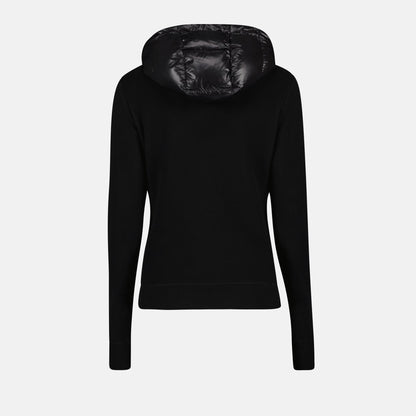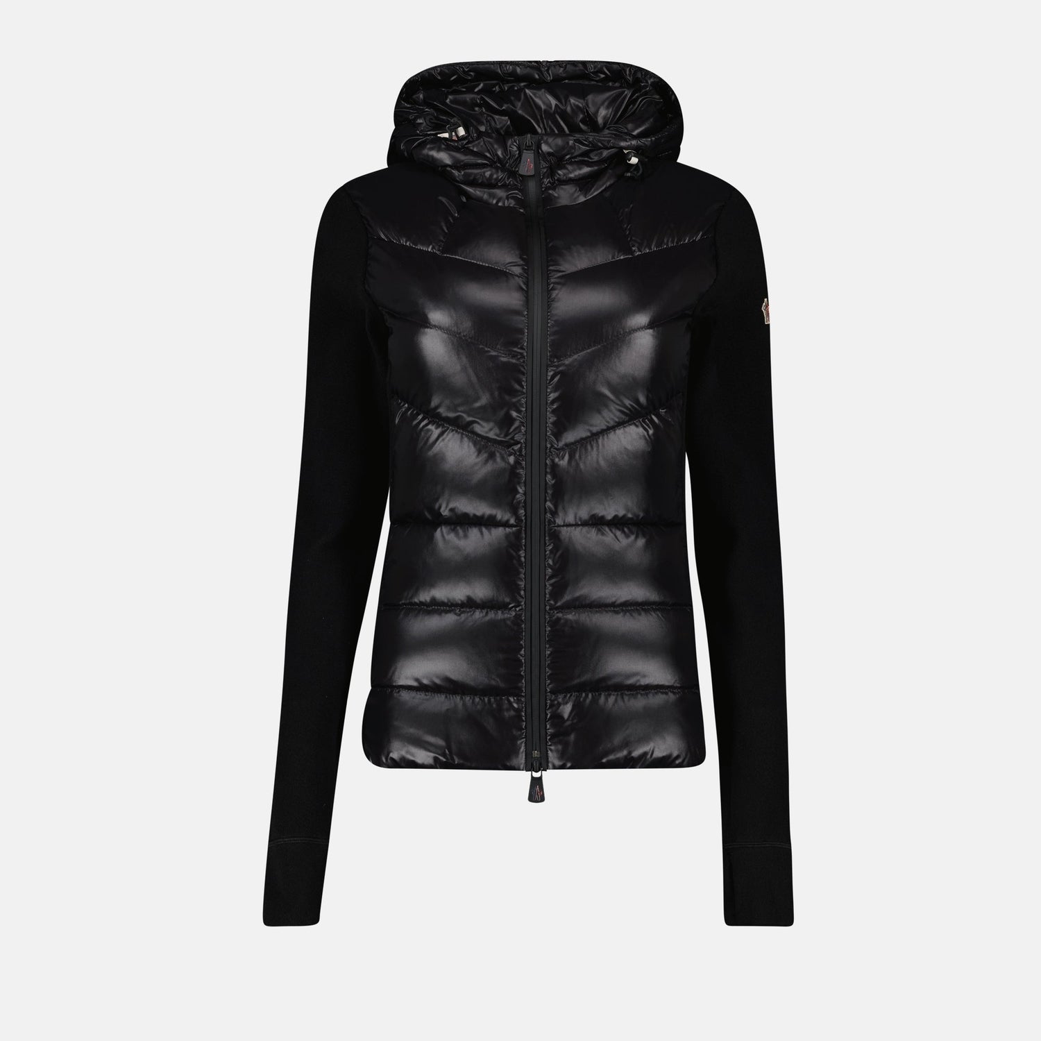 Experience the perfect blend of style and comfort with Moncler Grenoble's black two-tone jacket from the Autumn-Winter 2024 collection. This piece stands out with its quilted nylon front and cozy knit back and sleeves. The elevation in detailing includes a high collar, a practical double-zip closure, and an embroidered Moncler logo on the sleeve. Flattering a tailored fit, this jacket is the epitome of modern refinement. Discover the functionality of zippered side pockets and an adjustable hood, making it an adaptable staple for any wardrobe.