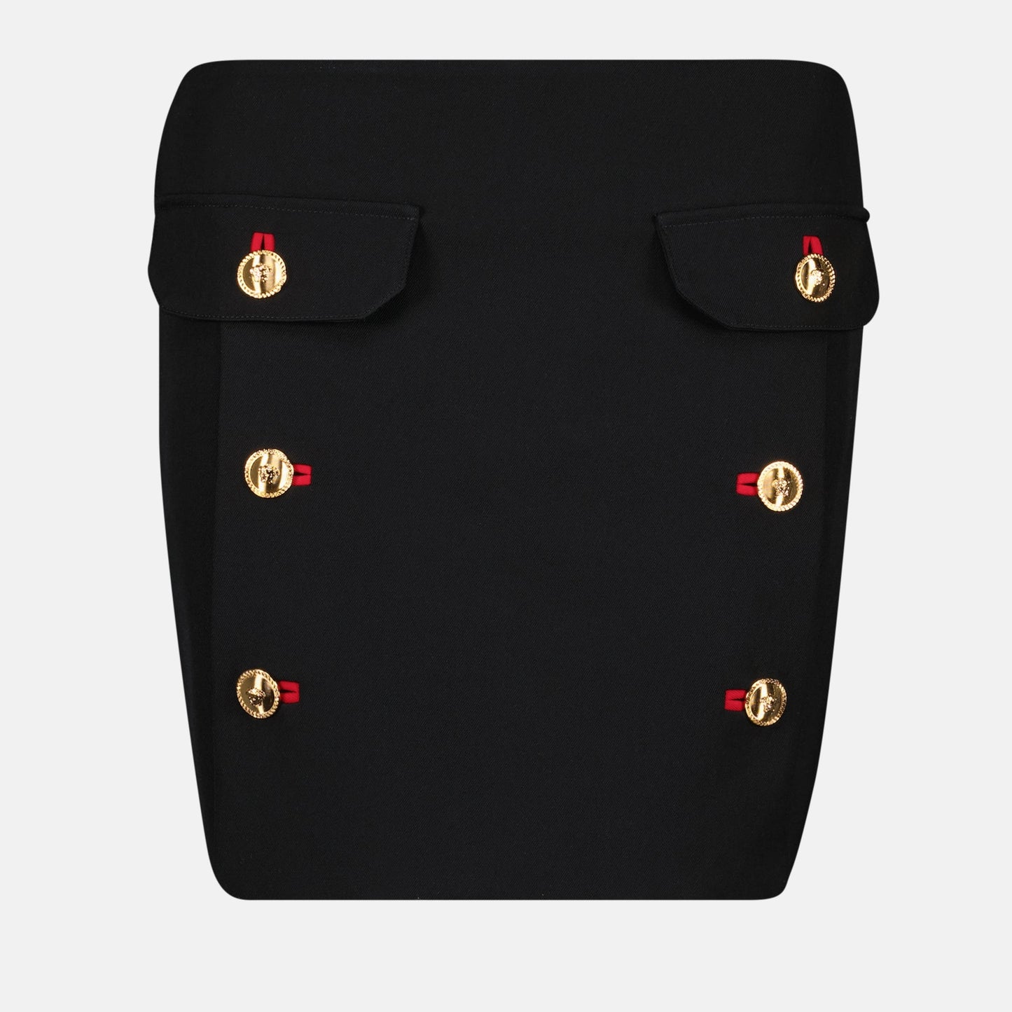 Step into sophistication with the black wool pencil skirt from Versace's Autumn-Winter 2024 collection. Crafted for a refined appearance, this skirt offers a sleek, short cut complemented by a concealed zip closure and functional flap pockets. The exquisite gold Medusa buttons add a touch of distinction, while the red thread finishes provide a subtle detail. Wear it with or without slits, thanks to the cleverly placed buttons. Pair with the matching jacket, available separately, to complete your ensemble. Experience understated elegance with this versatile piece.