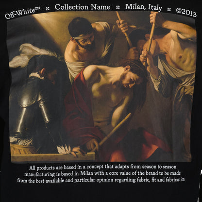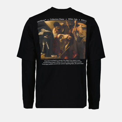 Embrace artistic flair with the Off-White Caravaggio Layered Men's T-Shirt. Perfect for the discerning gentleman looking to add a touch of contemporary artistry to his wardrobe. This t-shirt boasts a striking Caravaggio print set against the clean, crisp backdrop of pure cotton fabric. Its long sleeves and straight cut provide a comfortable fit that suits various body types. The round neck and printed logo add to its aesthetic appeal. The pièce de résistance? An intricate Caravaggio artwork displayed prominently on the back, ensuring that your style speaks volumes, regardless of the angle.
