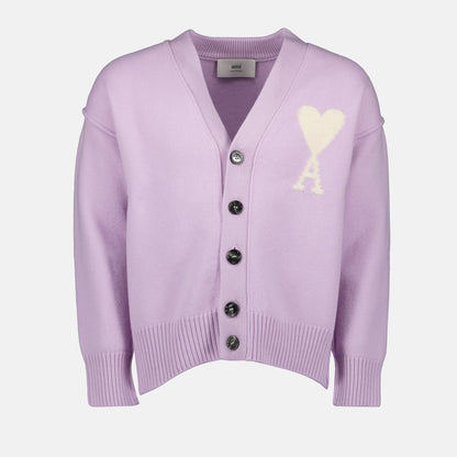 The Ami de coeur cardigan in a rich violet hue is a versatile addition to any wardrobe. Crafted from fine wool, this unisex cardigan features a flattering V-neck, long sleeves, and a classic straight cut. Its button closure and ribbed edges enhance its sophisticated appeal while showcasing the embroidered Ami de coeur logo for a touch of distinction. Perfect for layering, this piece effortlessly complements both casual and refined outfits, making it a must-have for the season.