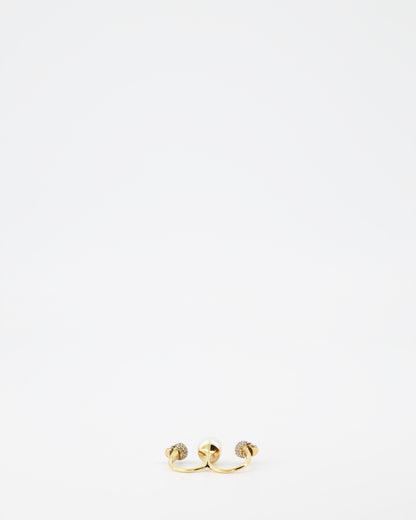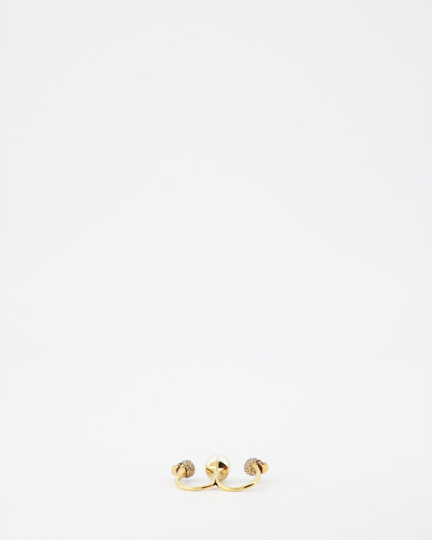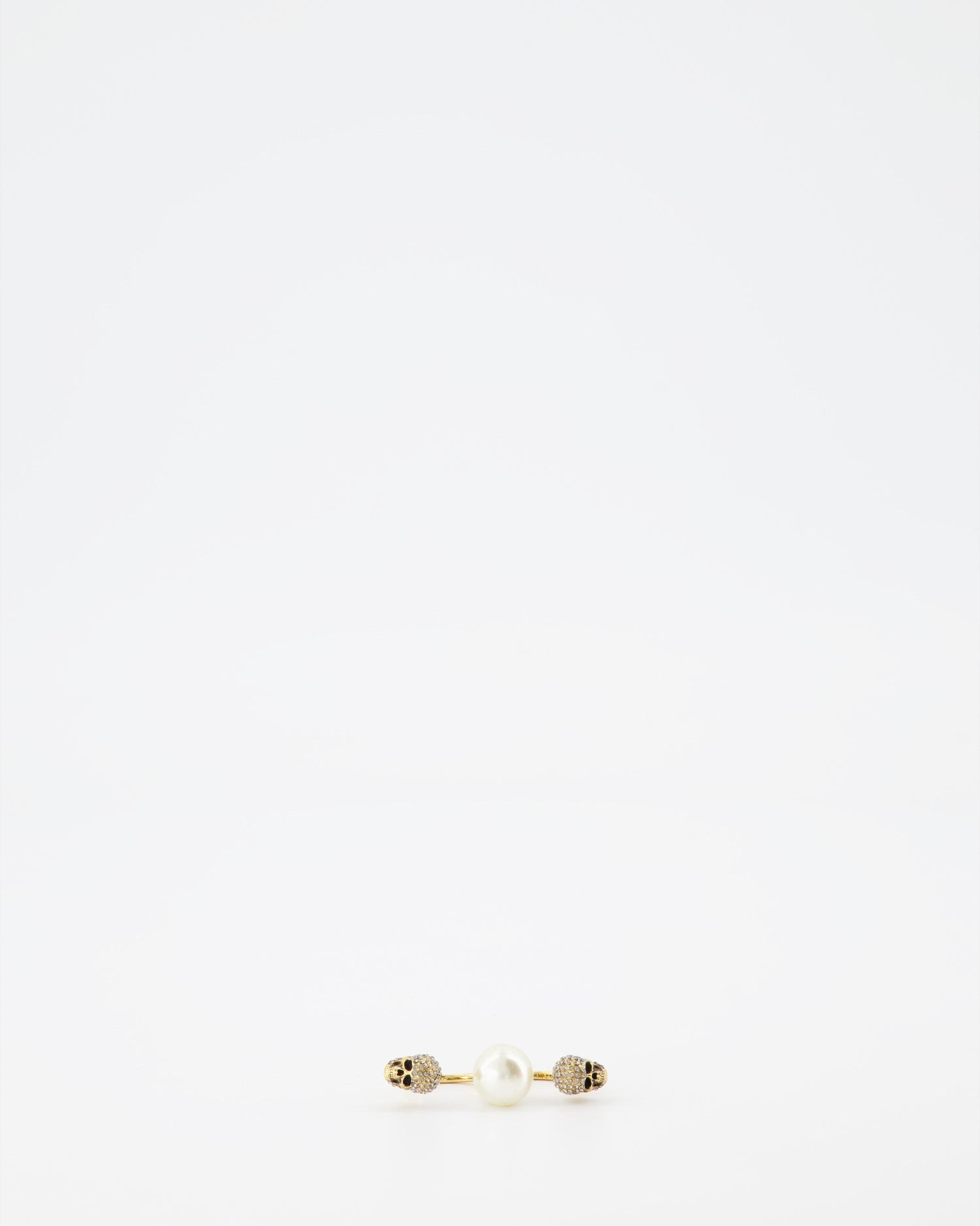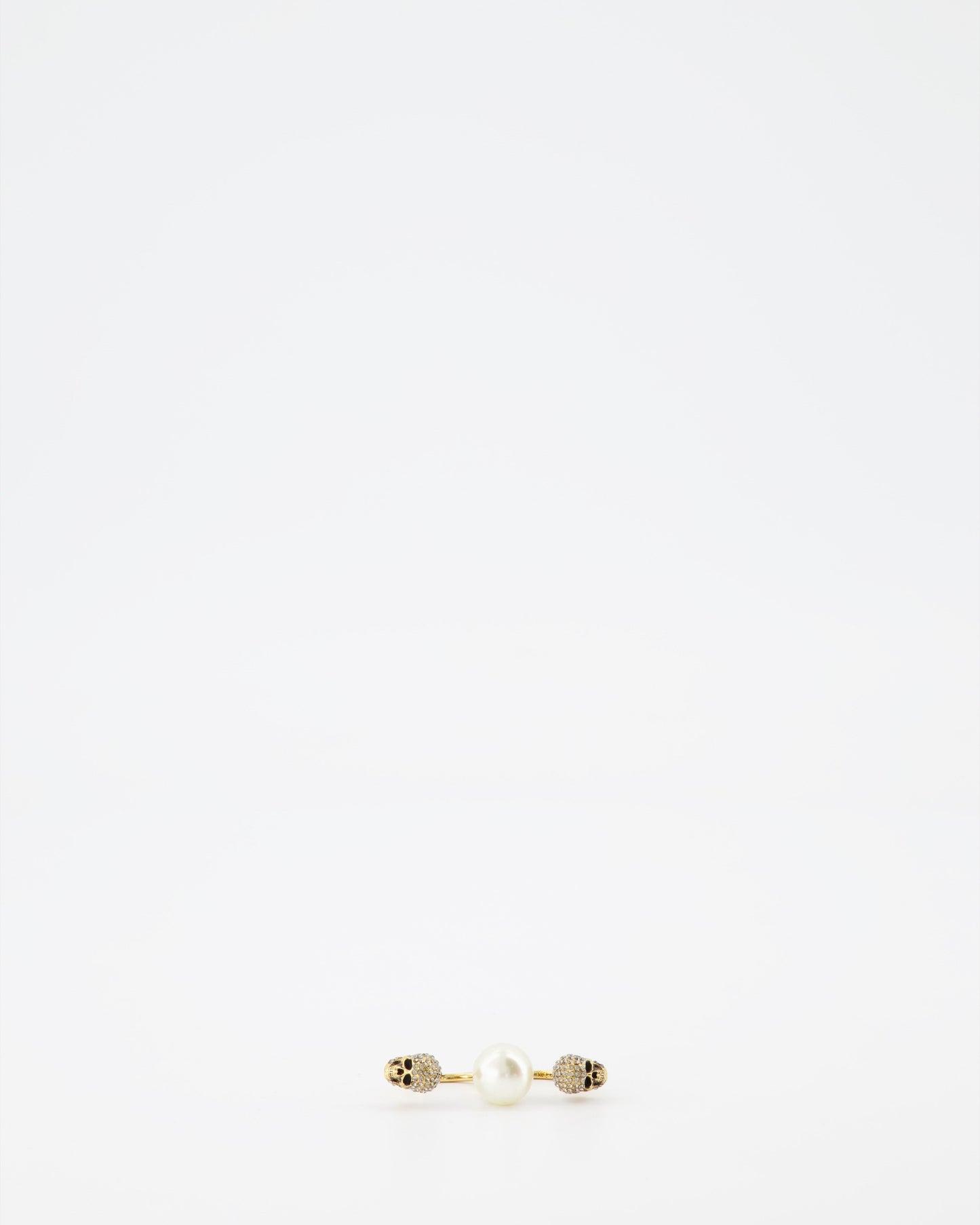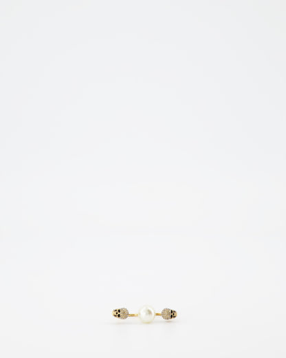 Indulge in the intricate artistry of the Alexander McQueen Double Skull Pearl Ring, a statement piece reflecting the brand's signature blend of elegance and edge. This double ring, masterfully crafted from gold-tone metal, showcases two iconic skull motifs, symbolizing both rebellion and sophistication. Adorned with a lustrous pearl, this accessory exudes a timeless charm while adding a touch of avant-garde to your ensemble.