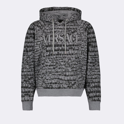 Indulge in the elegance and comfort of the Coccodrilo hoodie by Versace, a symbol of sophisticated style. This exquisite grey hoodie showcases Versace's commitment to luxury and attention to detail. Crafted from premium materials, it features a seamless blend of comfort and high fashion. The subtle grey color exudes a timeless charm, perfect for any refined wardrobe.