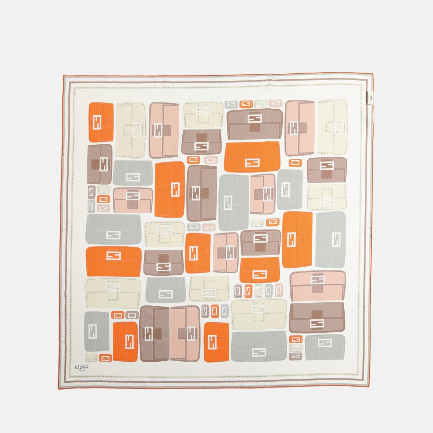 Introducing the Fendi Baguette orange scarf, a beautiful accessory crafted from luxurious silk. This square-shaped scarf features a stunning graphic inspired by the signature Baguette bag, making it an eye-catching addition to your collection. The intricate details, including a logo-stitched label and hand-rolled edges, highlight the exceptional craftsmanship that defines this piece. Perfect for the Spring-Summer 2025 collection, this scarf brings a burst of color and style, enhancing both casual and formal looks with its sophisticated charm.
