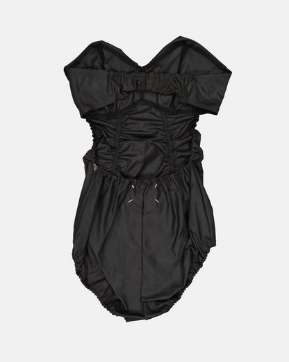 Be bold and elegant with this Black Ruched Bodysuit by Maison Margiela. Designed to enhance the female silhouette, this bodysuit is made from soft and comfortable fabric. It features a fitted cut with delicate ruching at the front, adding a touch of sophistication to your look. With its thin straps and V-neckline, this bodysuit can be worn alone or paired with a high-waisted skirt or trousers. Perfect for a chic evening or a stylish day, this Maison Margiela bodysuit is an essential for any woman seeking an elegant and timeless piece.