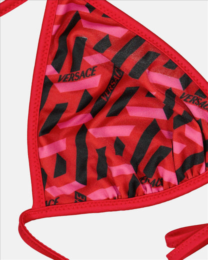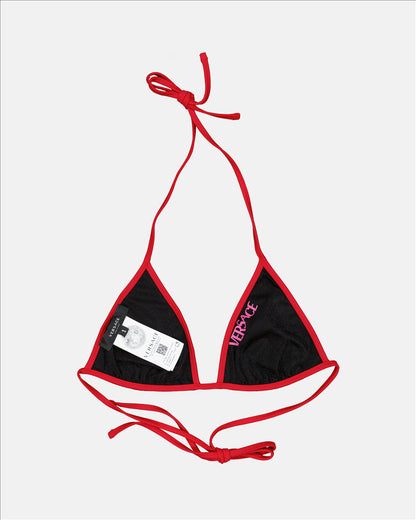 Add a touch of luxury to your beachwear wardrobe with the red Greca bikini top from the renowned high fashion house, Versace. Crafted from superior quality fabric, this bikini top is distinguished by its emblematic Greca pattern and vibrant color that is sure to make a splash on the beach or by the pool. With its adjustable straps and optimal support, it ensures a perfect fit and unparalleled comfort. Bring timeless elegance to your sun-soaked getaways with this red Greca bikini top by Versace.