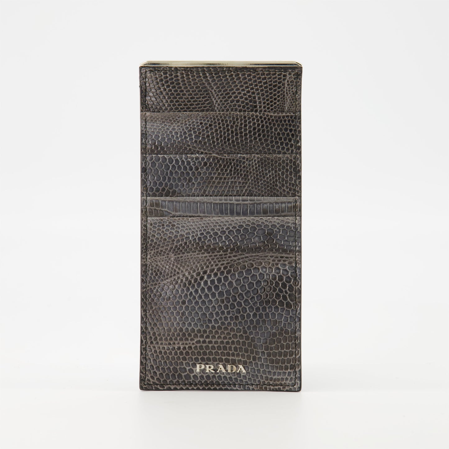 This grey crocodile effect leather cardholder showcases a refined design with a striking metallic logo. With multiple card slots, it combines practicality with a sleek, vertical silhouette, making it an ideal accessory for organizing your essentials. Crafted with a textured finish that mimics crocodile leather, this cardholder adds a touch of sophistication to your everyday needs. Perfect for those who appreciate understated elegance, it seamlessly fits into both casual and formal settings.