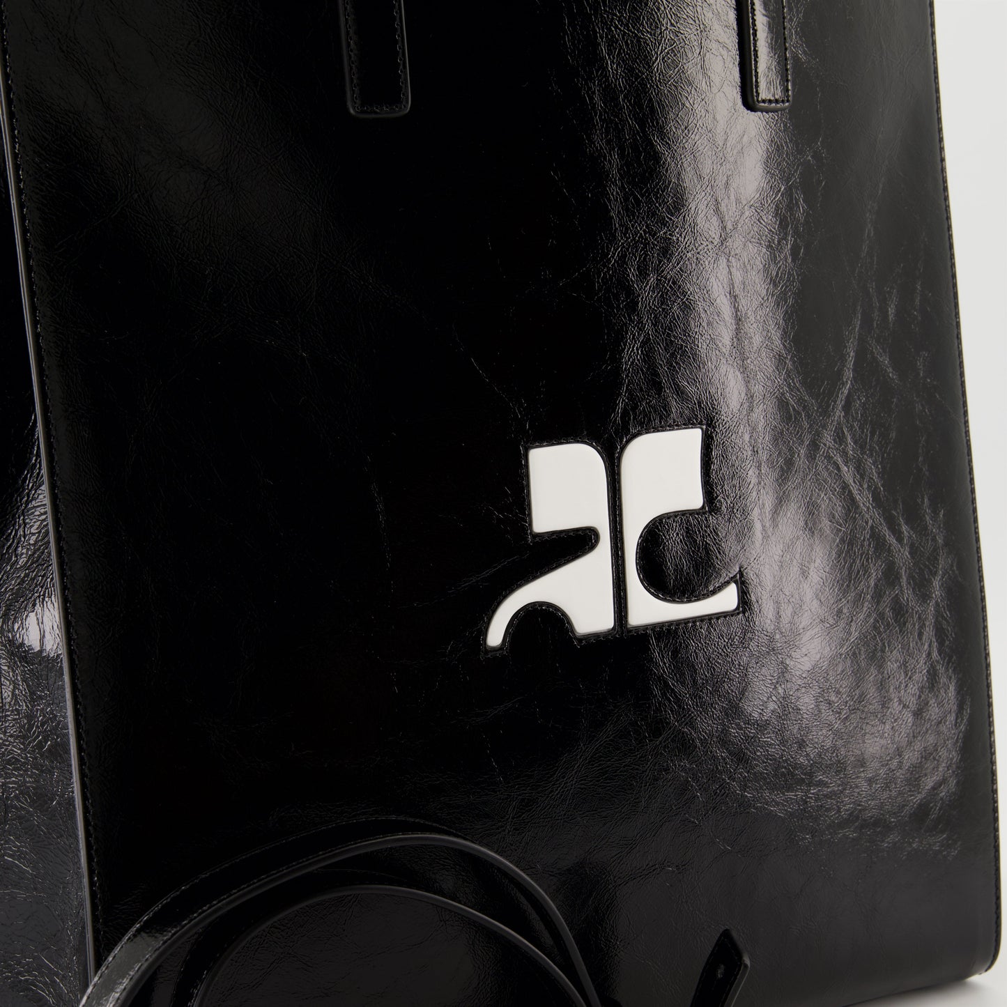 Introducing the Heritage Tote Bag by Courrèges, a standout piece from their Autumn-Winter 2024 collection. This luxurious accessory is meticulously crafted in high-quality, glossy black leather, embodying sophistication and contemporary style. The shiny finish adds a refined touch to this classic silhouette, making it an exceptional addition to any wardrobe.