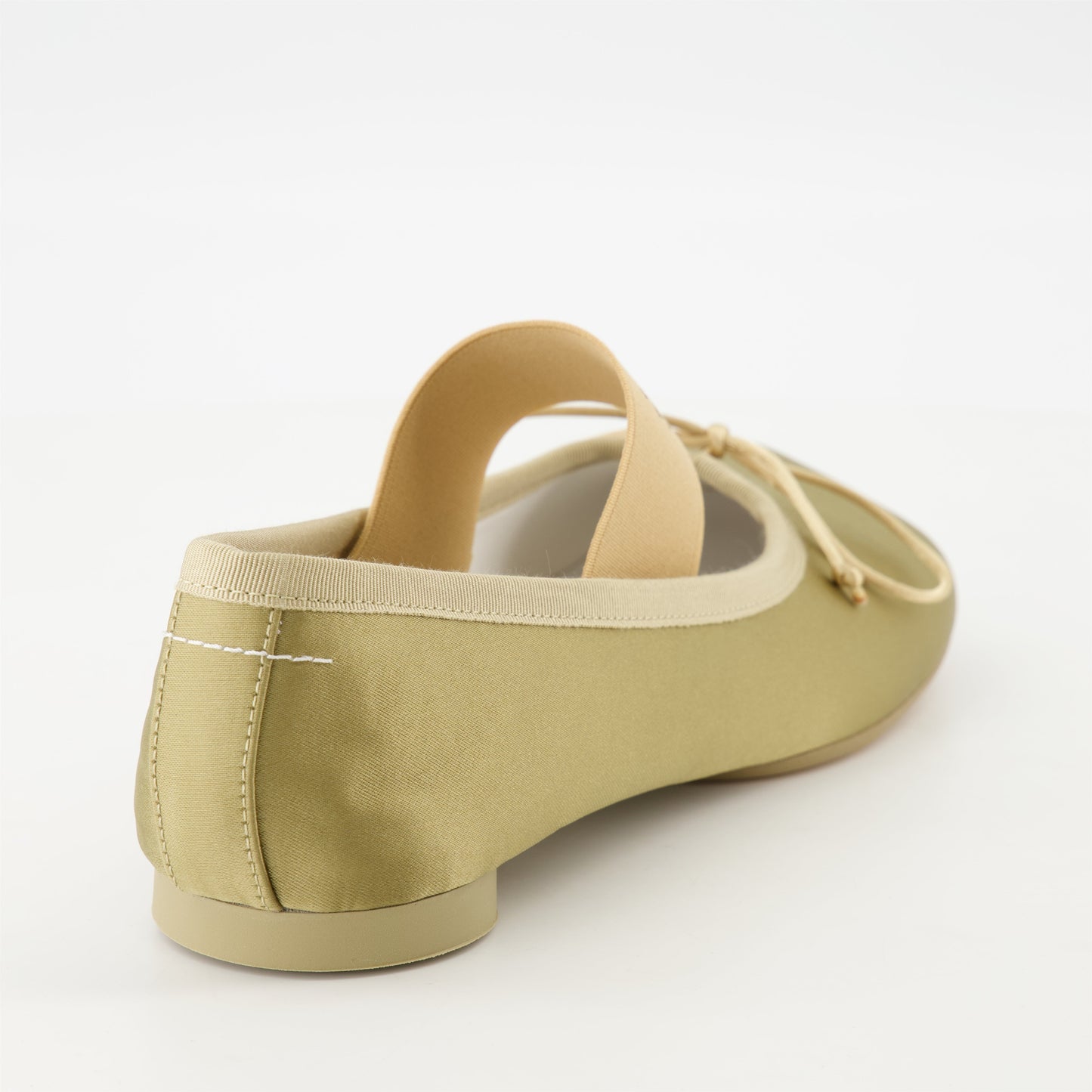Step into sophistication with the MM6 khaki satin ballerines. Designed with a signature elastic and a refined knot at the front, these shoes elegantly embrace both comfort and style. The unique anatomical shape and cylindrical heel provide a flattering silhouette, while the white stitching detail adds a touch of modern charm. Ideal for the warmer months, these ballerines are a versatile addition to elevate your wardrobe.