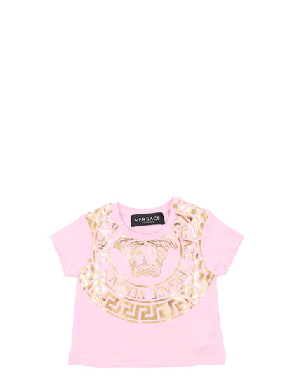 Introduce your little one to the world of luxury fashion with the La Medusa T-Shirt in Rose by Versace. This beautifully crafted piece features the iconic Medusa head motif prominently displayed on soft, premium-quality fabric. The delicate rose hue adds a touch of sophistication, complementing the intricate design and impeccable tailoring. Ideal for both casual and slightly dressier occasions, this versatile t-shirt ensures your child stands out with a statement of elegance and refined style. Versace's dedication to superior materials and exceptional detail is evident in every stitch, promising both comfort and durability. Elevate your child's wardrobe with this distinguished tee that speaks of timeless luxury and modern flair.