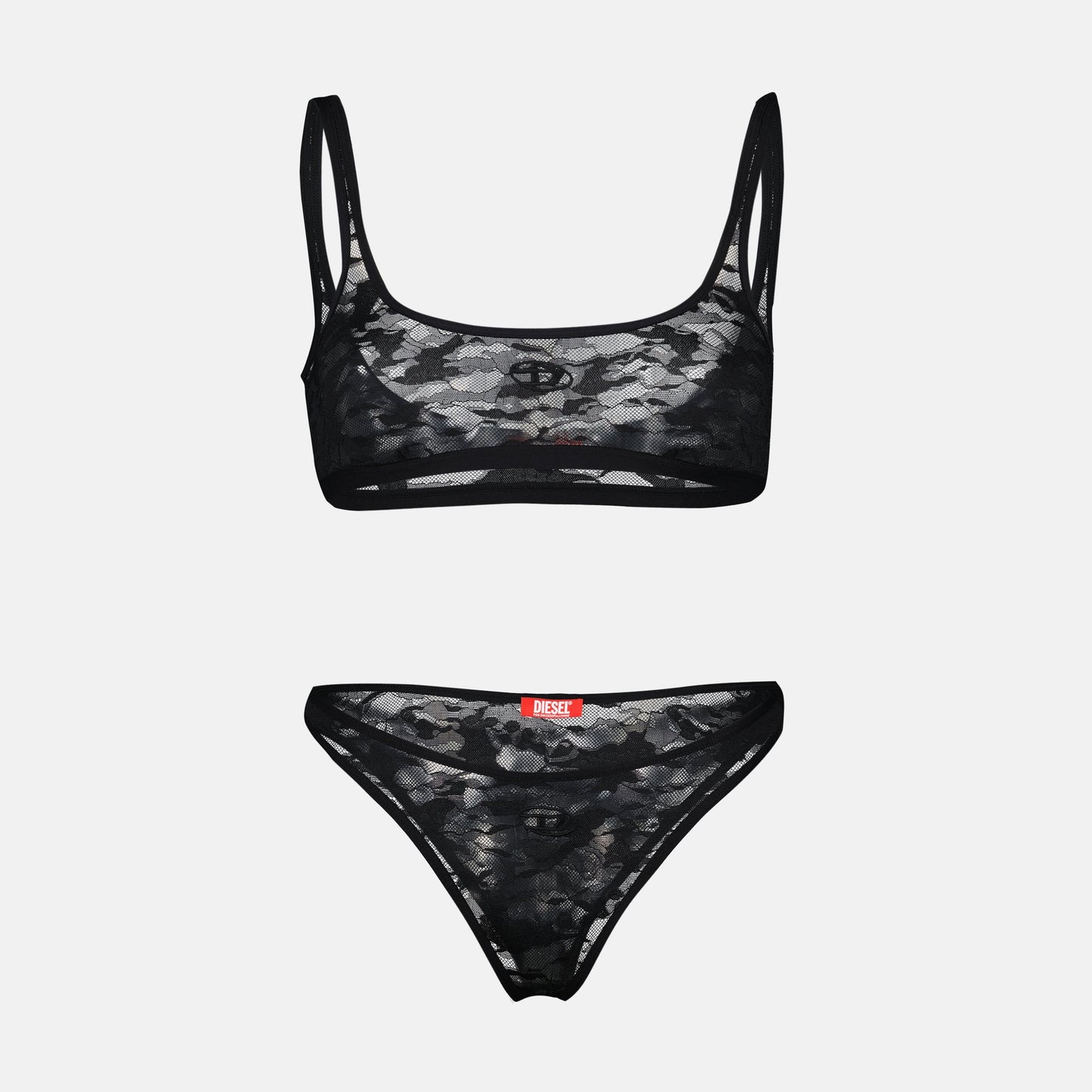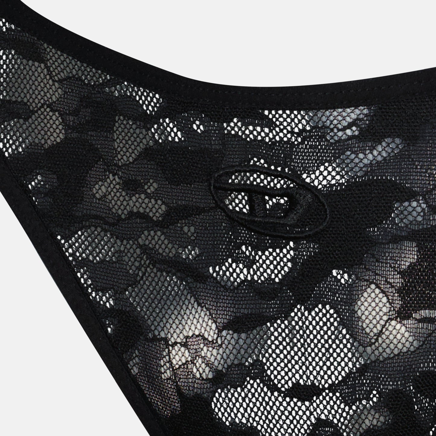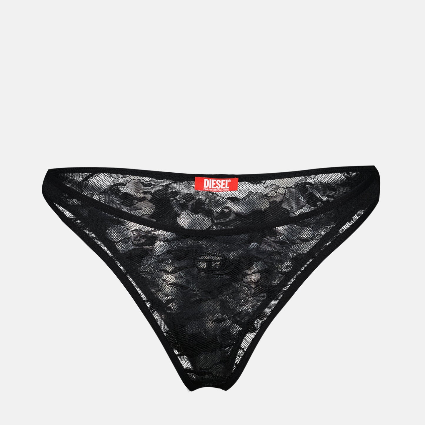 This black lace tanga from Diesel highlights a daring cut-out design complemented by a contrasting trim. The iconic Oval D logo serves as a statement piece, showcasing both boldness and refinement. Crafted from delicate lace, this tanga ensures comfort while maintaining a chic aesthetic. Pair it with the matching bra, sold separately, for a complete set that exudes confidence.