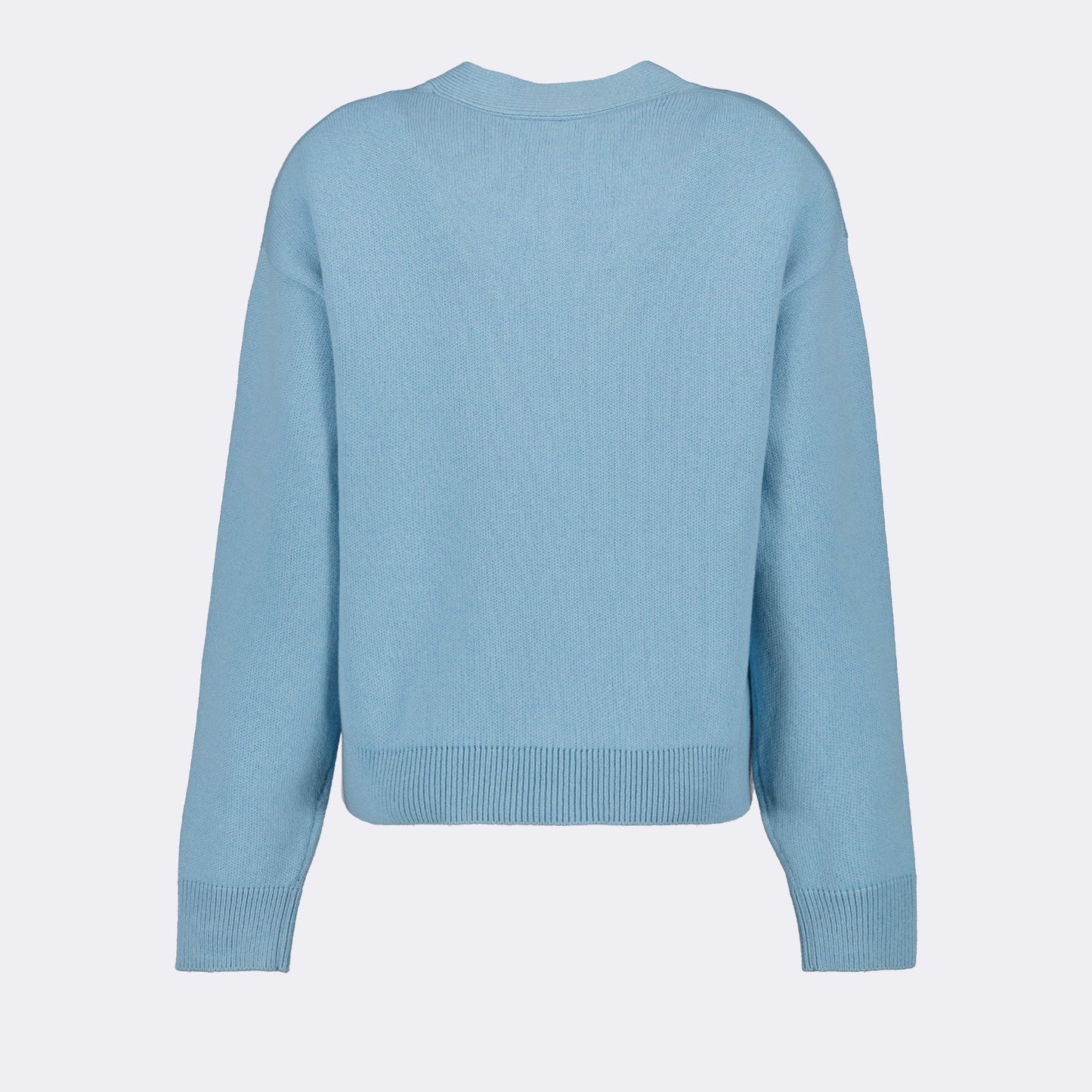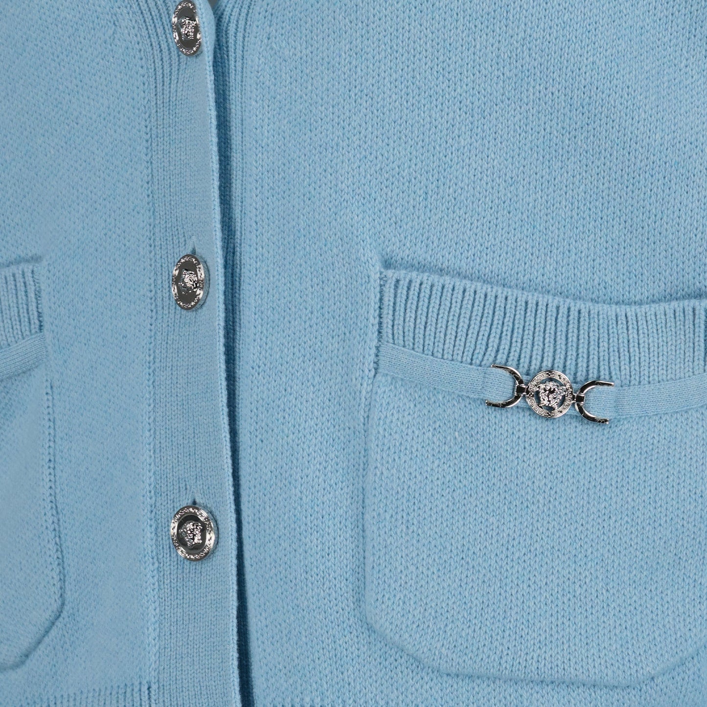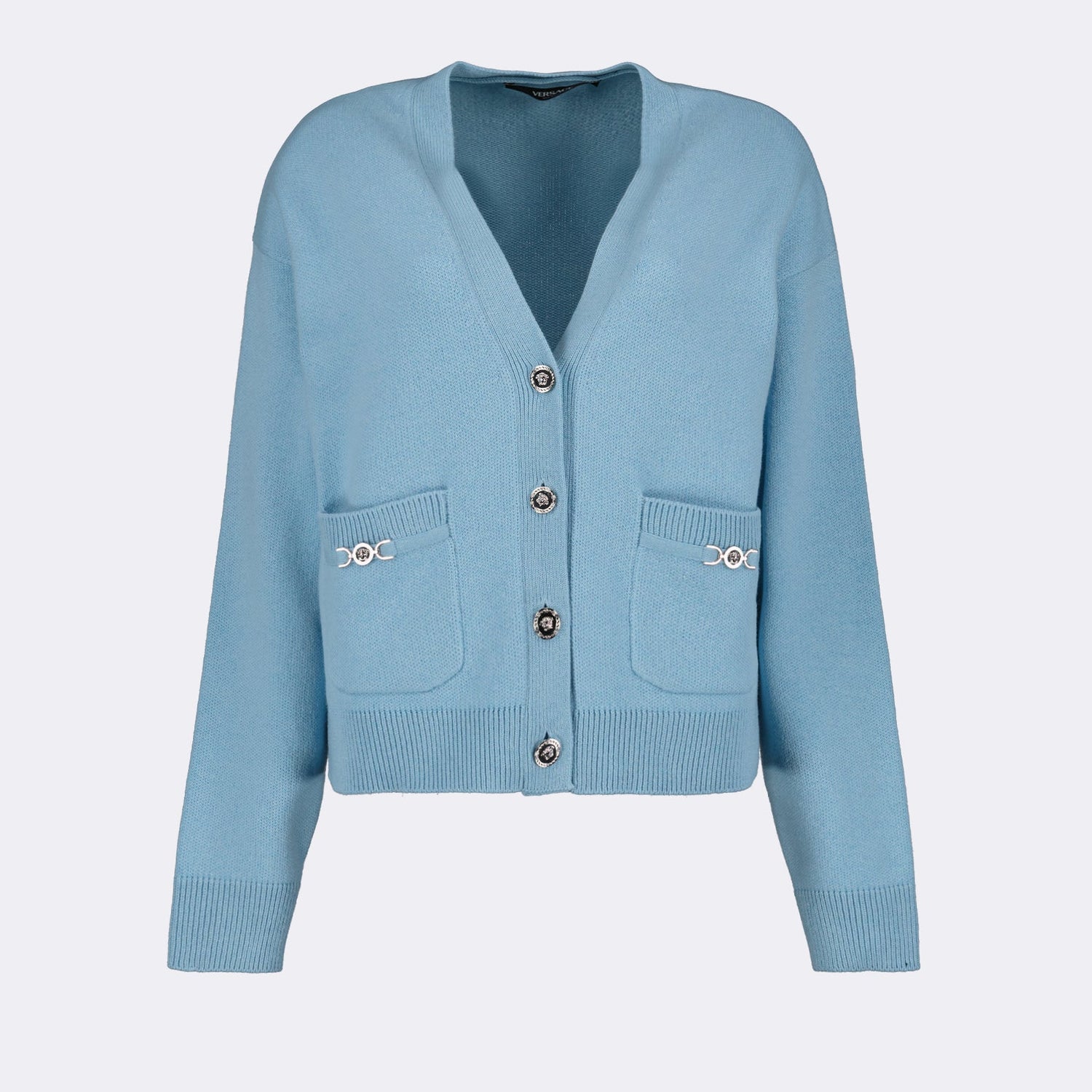 Presenting the luxurious blue wool cardigan by Versace, an epitome of sophistication and elegance. Crafted from premium wool, this cardigan promises unparalleled comfort and warmth. The deep blue hue adds a regal touch, making it a versatile addition to your closet. The intricate knit detailing reflects the exquisite craftsmanship associated with the Versace brand. The cardigan features a chic button-down front, allowing for easy layering over your favorite outfits. Whether heading to a casual outing or an upscale event, this cardigan guarantees a refined look.