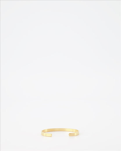 Crafted in shimmering gold, the sleek, polished finish of this cuff bracelet accentuates its refined simplicity. Its open-ended design ensures a comfortable fit, gracefully encircling the wrist with an air of subtle sophistication. Whether worn as a solitary statement piece or layered with other accessories, this bracelet seamlessly complements a range of styles, from chic evening wear to casual day outfits.
