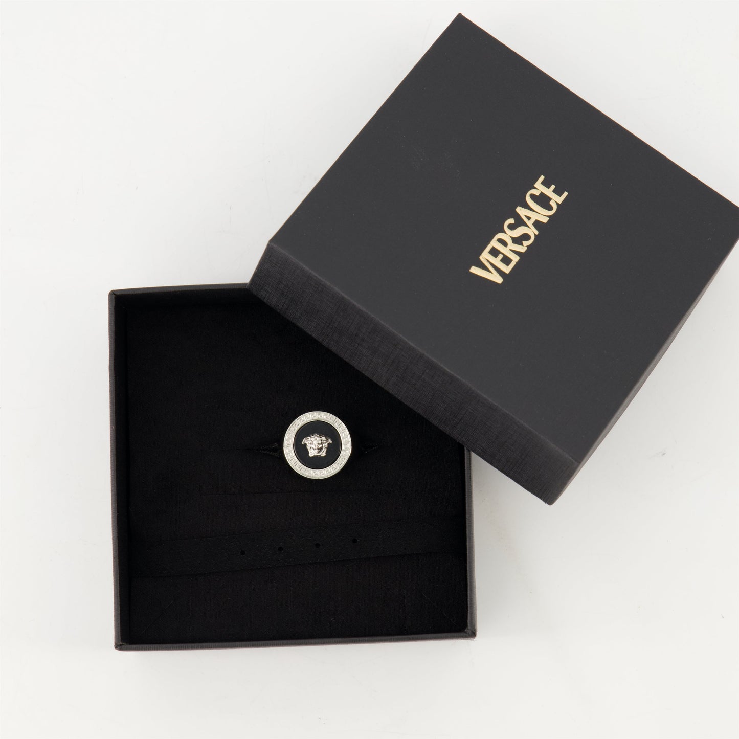 Introducing the Medusa Ring in silver, an exquisite accessory from Versace. This striking piece showcases the iconic Medusa logo in relief, framed by beautiful Greca engravings that enhance its unique charm. Made from high-quality brass, the ring radiates a polished finish that complements any ensemble.