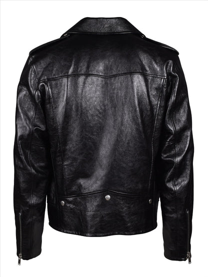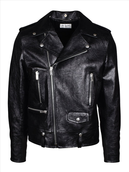 The Men's Black Leather Perfecto Jacket by Saint Laurent epitomizes luxury and sophistication. Crafted from premium-quality black leather, this jacket showcases Saint Laurent's dedication to impeccable craftsmanship and timeless design. The jacket features a classic moto-inspired silhouette with a structured fit that effortlessly enhances the wearer's profile. The design includes signature elements such as a notched lapel, asymmetrical front zip closure, and multiple zippered pockets, providing both style and functionality. The sumptuous leather used in this jacket not only offers durability but also a sleek, polished finish that exudes a sense of understated elegance. Perfect for any occasion, this jacket is a must-have for the discerning man who appreciates refined fashion and superior quality. Indulge in the luxury of Saint Laurent and elevate your wardrobe with this iconic Perfecto jacket.
