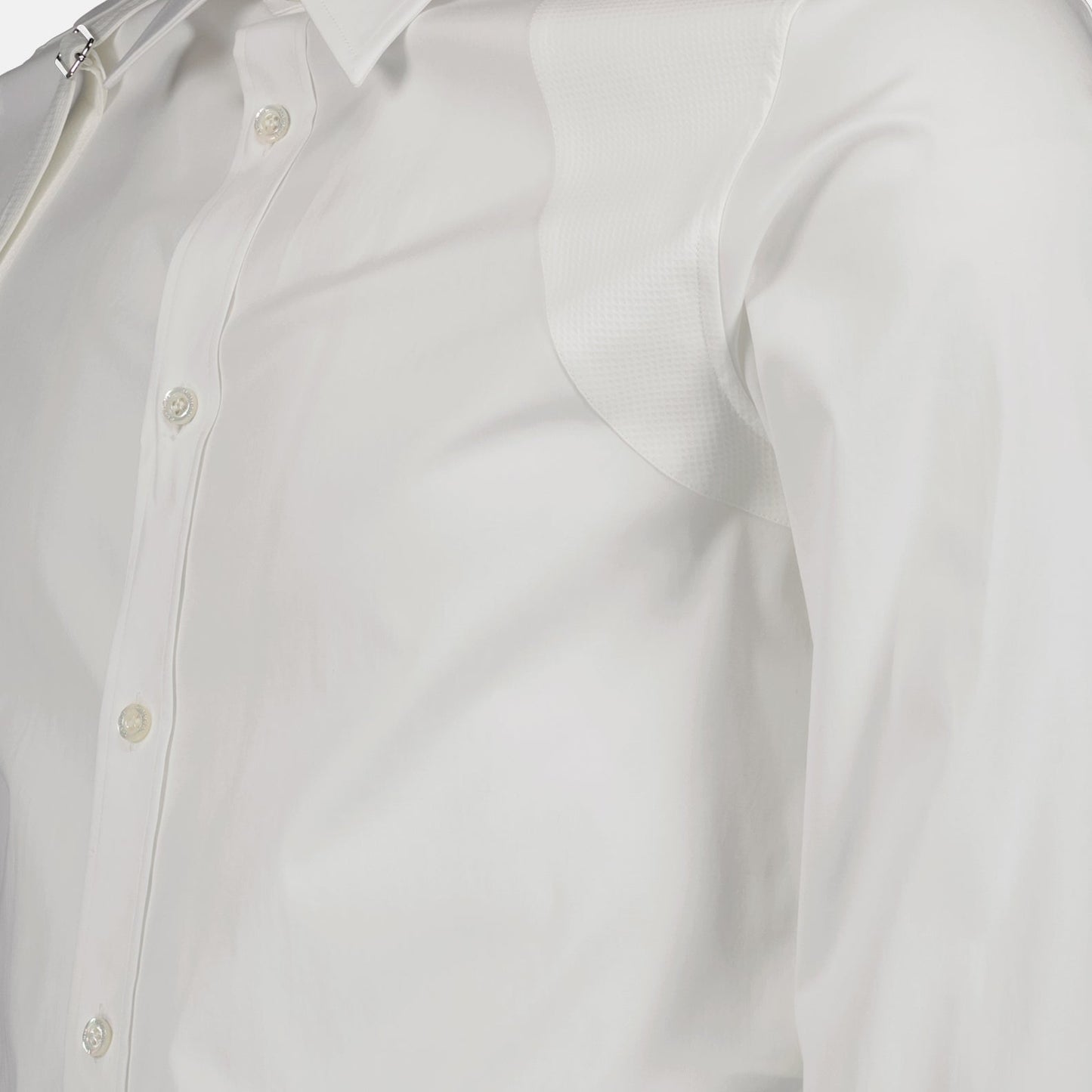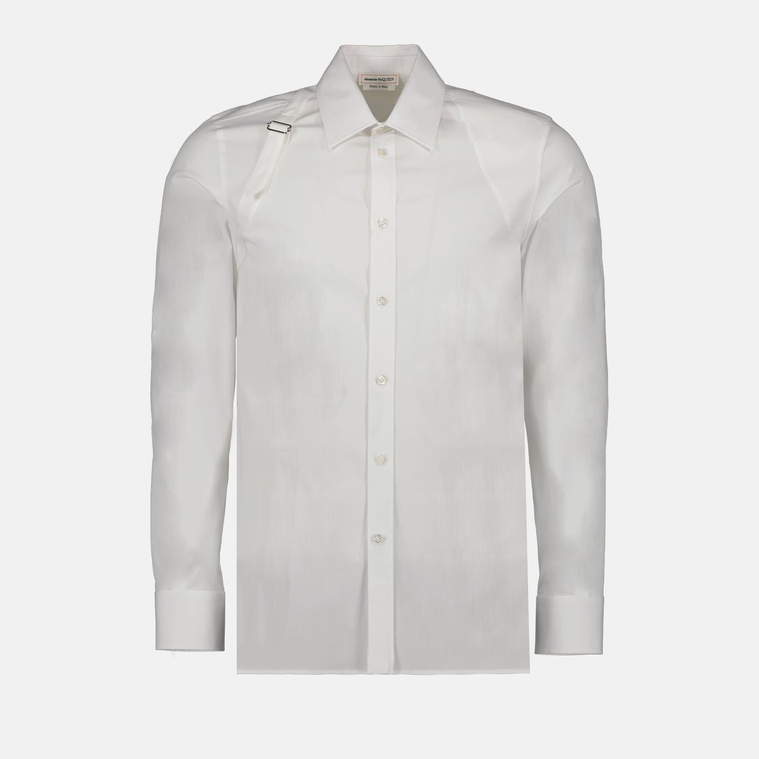 Unveil the epitome of elegance with the Men's White Strap Shirt by Alexander McQueen, a masterpiece that seamlessly merges contemporary style with timeless sophistication. Crafted with meticulous attention to detail, this shirt is distinguished by its unique strap detailing, providing a subtle yet distinctive edge.