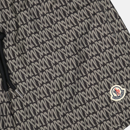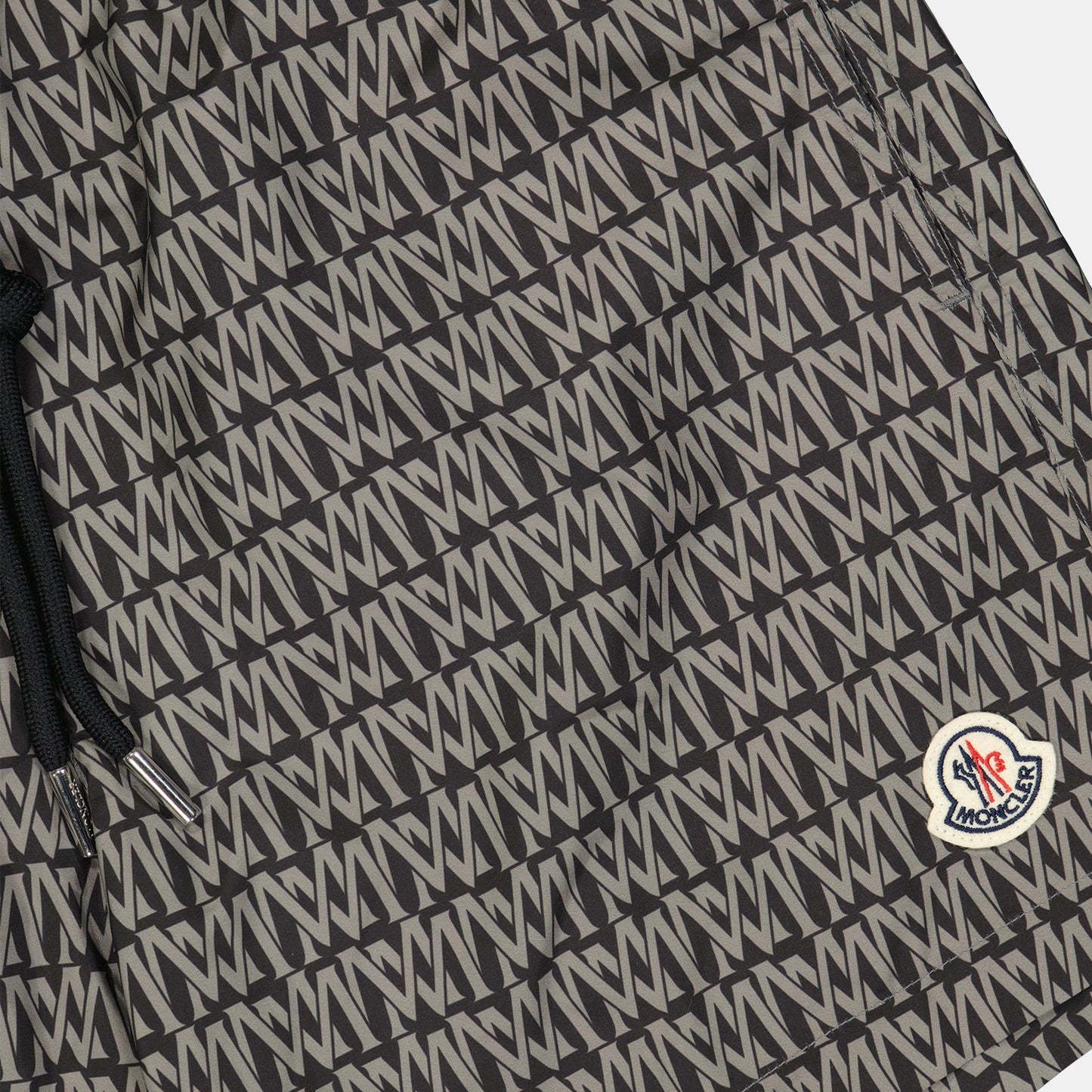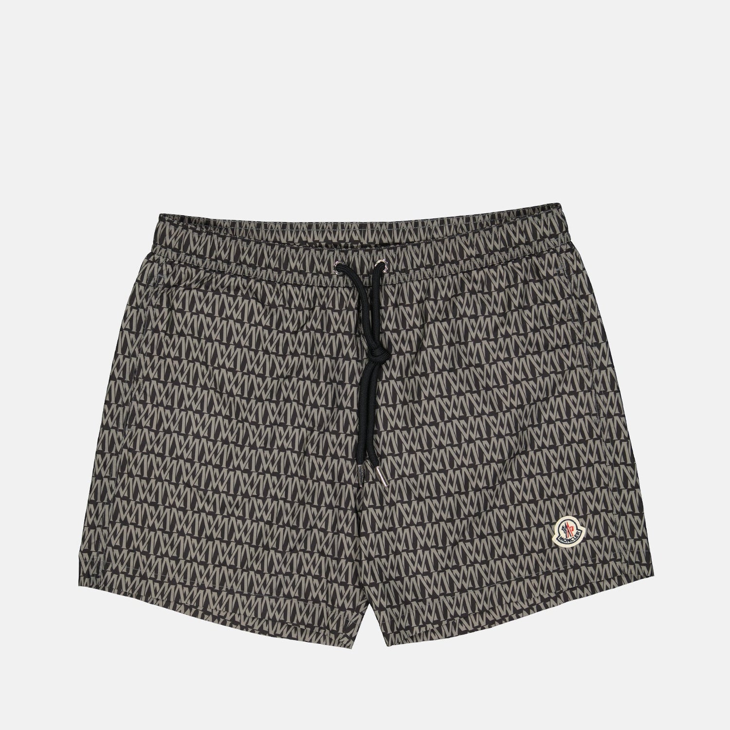Monogrammed swim shorts, luxury beachwear, Moncler, black and white swim shorts, high-end swimwear